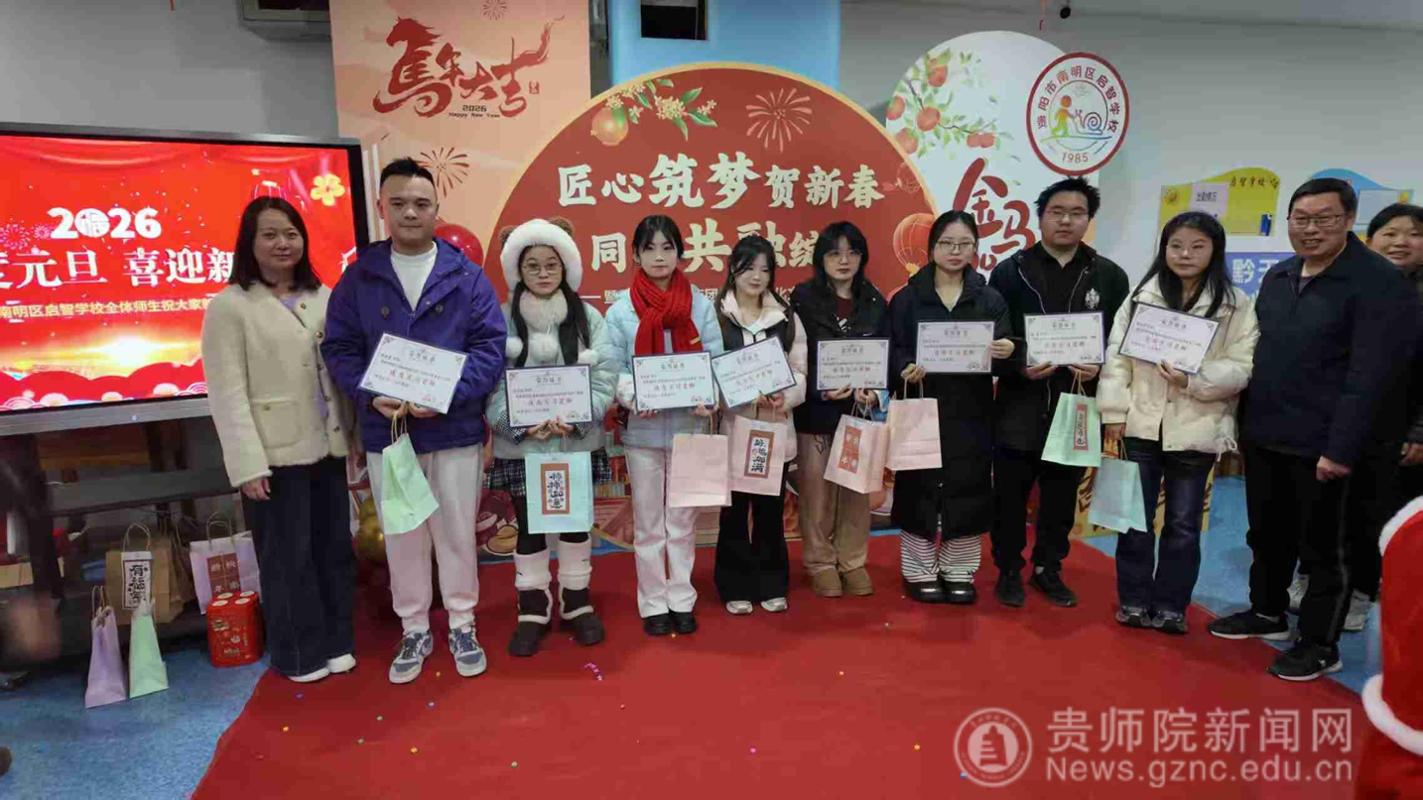 指导教师团队一行抵达贵阳市南明启智学校,开展特殊教育专业实习生实习成果验收工作。验收工作中,特殊教育系雷经国主任立足专业培养目标,对实习生数月来的课堂教学实践、个别化教育计划制定与实施、问题行为干预等实习成果进行全面细致的核查与总结,既肯定了实习生们将理论知识转化为教学实践的扎实成效,也针对实习过程中暴露的细节问题提出切实可行的改进建议。学院傅小芳书记随后发表讲话,她首先向南明启智学校为实习生提供优质实践平台、倾注悉心指导表示诚挚感谢,同时寄语全体实习生,要珍视此次特殊教育实习经历,牢记教育初心,在未来的专业道路上深耕细作,用爱心与专业为特殊儿童的成长保驾护航。同时对特殊教育系已毕业学生就业和工作适应、实习生的就业期望和准备、以及就业单位南明启智学校的用人满意度进行了调研分析和拓展就业岗位的合作建议等。验收工作结束后,傅书记和雷经国主任一行受邀参与了南明启智学校精心筹备的元旦庆祝活动,与师生们一同沉浸在欢乐祥和的节日氛围中。