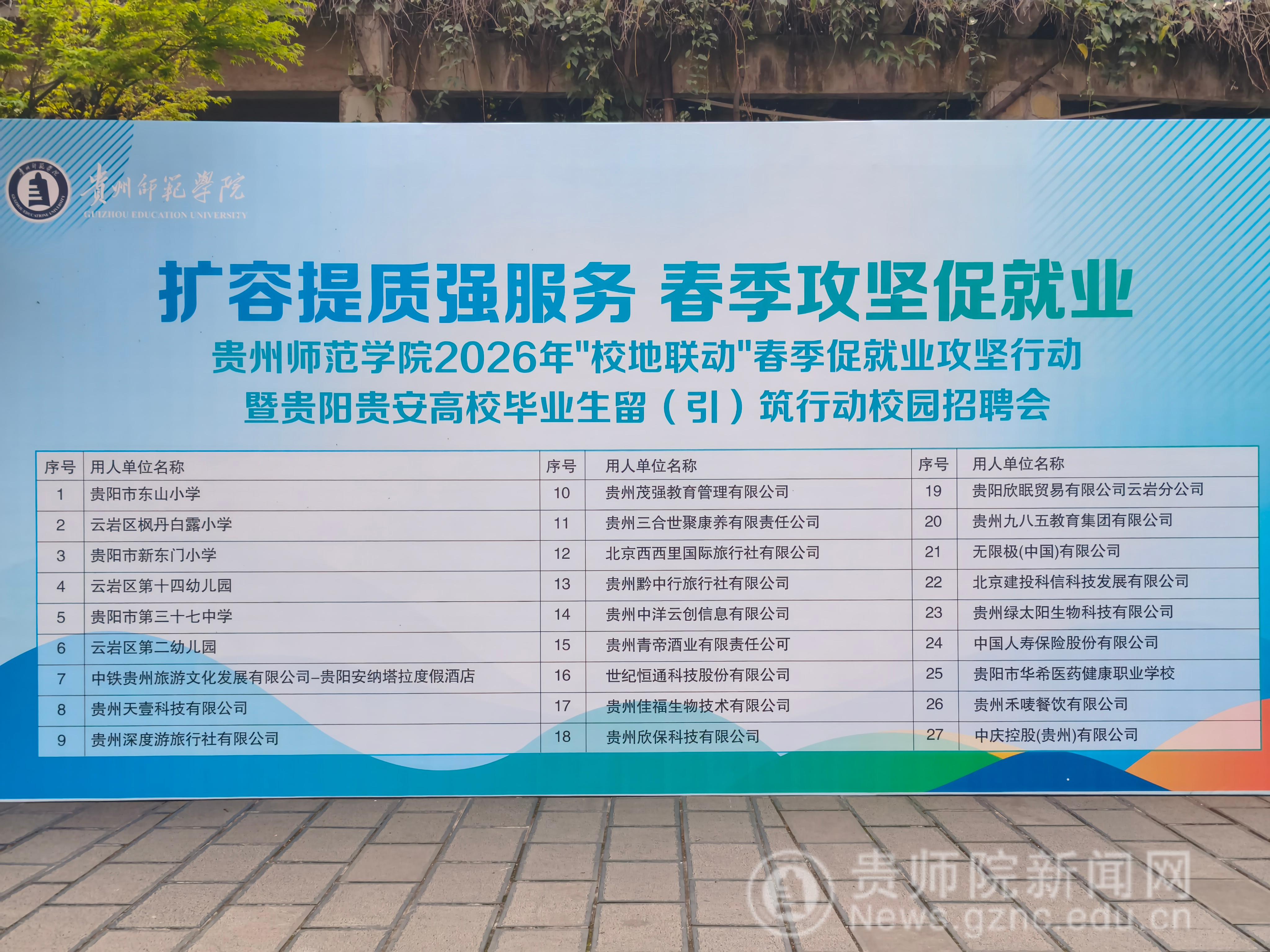 、生物科学学院、化学与材料学院及云岩区人才服务中心共同承办的2026年“校地联动”春季促就业攻坚行动暨贵阳贵安高校毕业生留(引)筑行动校园招聘会贵州师范学院专场,在学校逸夫楼凤凰广场成功举行。