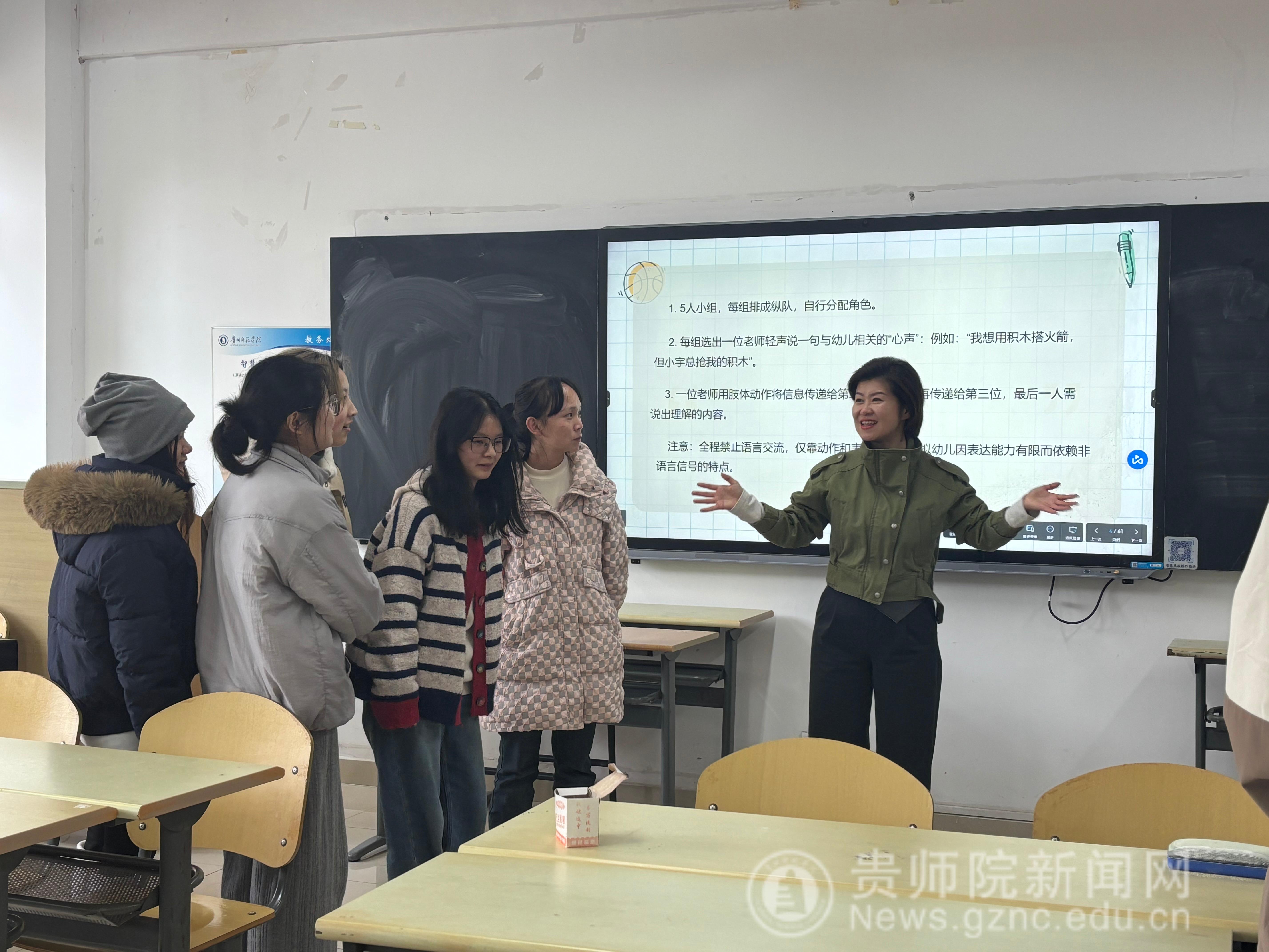 培训伊始,姜婷副园长以趣味游戏导入,打破了传统培训的严肃氛围。她将全体学生分为两组,每组5人,开展“你画我猜”互动游戏,在轻松愉悦的氛围中,引导学生深刻体会“倾听”在沟通中的重要性,自然引出本次培训的核心主题——倾听,让学生在实践体验中初步领悟,作为学前教育工作者,倾听是读懂幼儿、开展保教工作的基础。