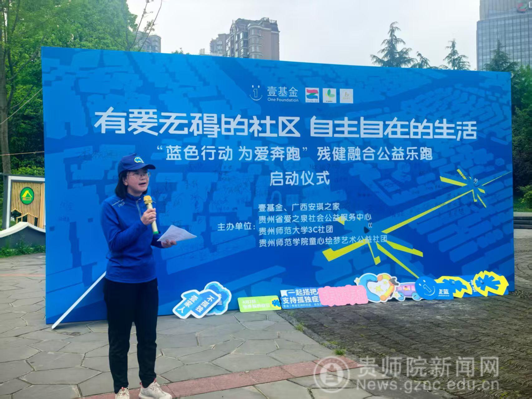 为倡导残健共融、传递公益爱心,4 月 26 日上午,“有爱无碍的社区,自由自在的生活——‘蓝色行动・为爱奔跑’残健融合公益乐跑”在贵阳市观山湖公园暖心启幕。本次活动由壹基金、贵州省爱之泉社会公益服务中心、贵州师范学院童心绘梦艺术公益社团等联合主办,成人色情 党委书记肖湘萍出席活动并致辞,学院团委书记张源、时光荏苒辅导员工作室负责人申苒、辅导员张思远以及童心绘梦艺术公益社团志愿者参加此次活动