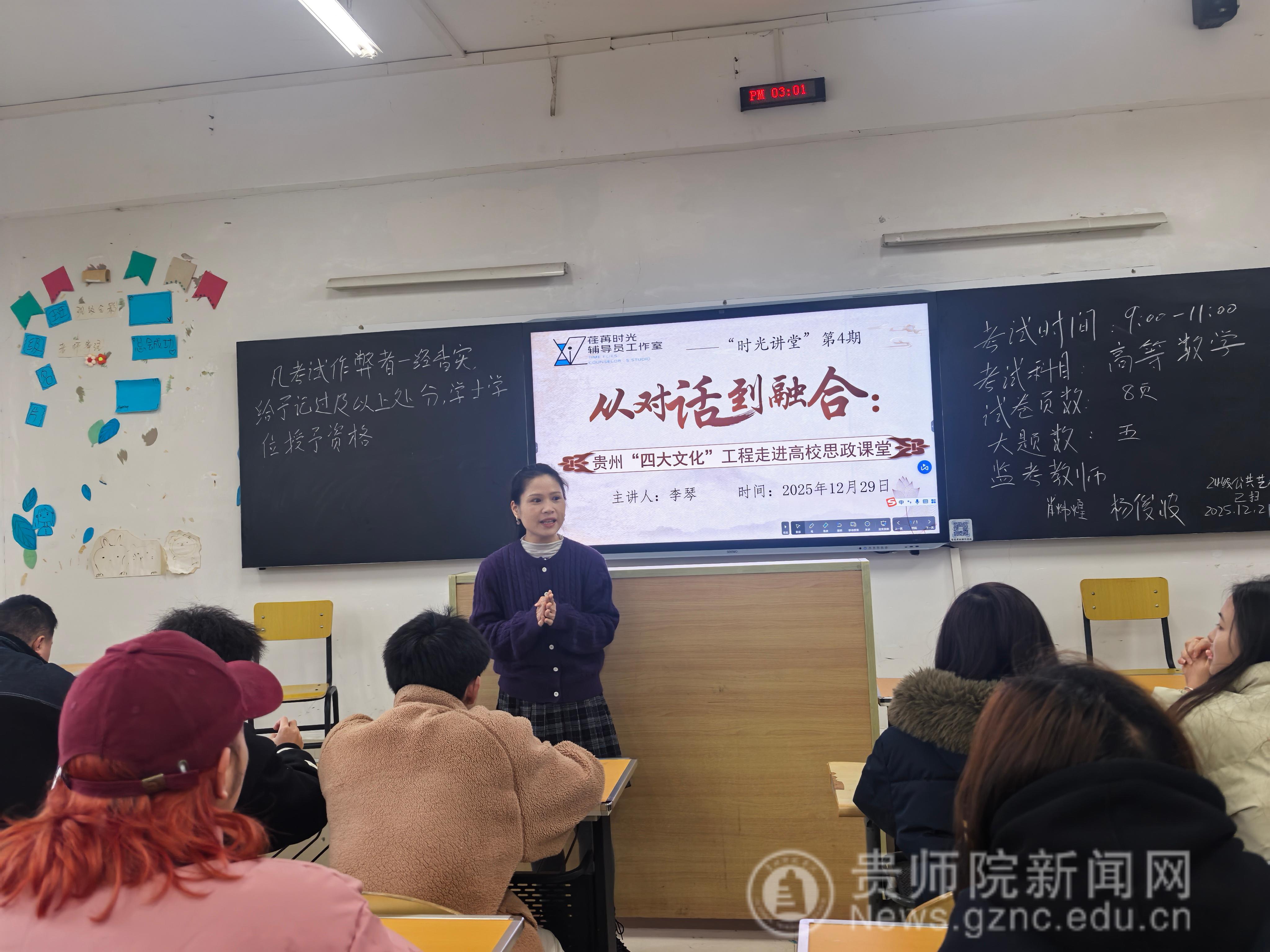 为推动贵州地方优秀文化与高校思想政治教育深度融合,将文化自信融入青年学子成长成才全过程,12月29日,荏苒时光辅导员工作室“时光讲堂”第四期活动在逸夫楼515教室顺利举办。本次讲堂以“从对话到融合——贵州四大文化工程走进思政课堂”为主题,由工作室核心成员、成人色情