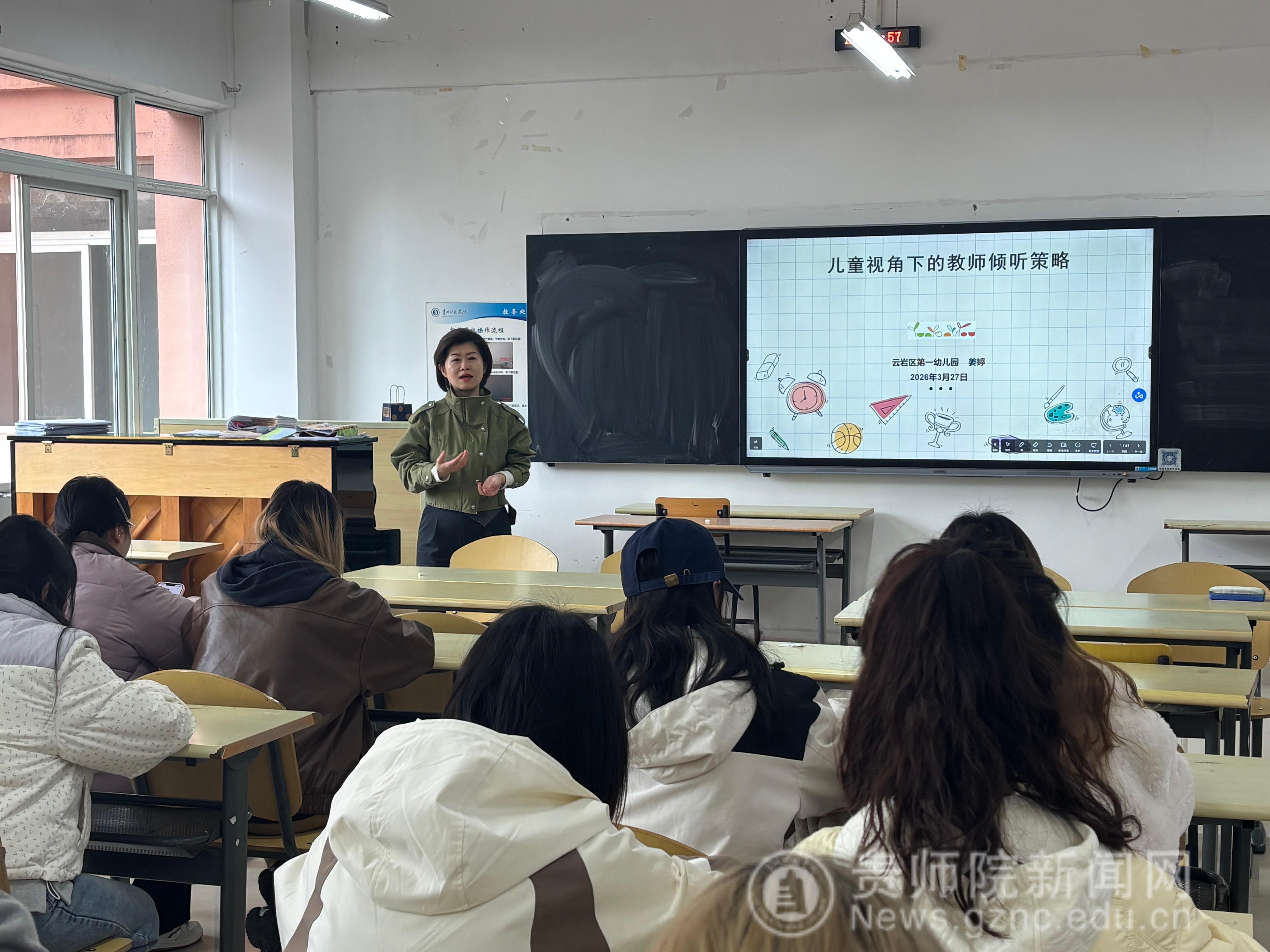 为帮助2023级学前教育专业学生顺利衔接幼儿园实习工作,提升专业实践能力,筑牢教育初心,2026年3月27日,我院特邀云岩区第一幼儿园副园长姜婷,为该专业全体学生开展实习前专项培训,以“儿童视角下的教师倾听”为核心,为即将踏入幼儿园实习的学子们送上了一堂兼具理论深度与实践温度的指导课。