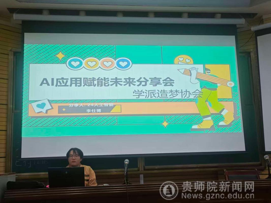 学派造梦协会在贵州师范学院举办“AI赋能未来”主题分享会。活动聚焦人工智能在大学生学业规划与职业发展中的实际应用,吸引了众多对AI技术感兴趣的同学参与,共同探讨如何以科技力量助力生涯成长。