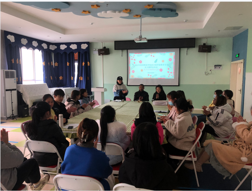 本次总结会由高新幼儿园保教主任孙秋老师主持。首先,幼儿园园长王家燕进行了实习工作总结,充分肯定了我院实习生在实习期间表现,并鼓励同学们继续努力。接着,张鸿翼老师和罗婷老师发言表达对幼儿园的感谢。