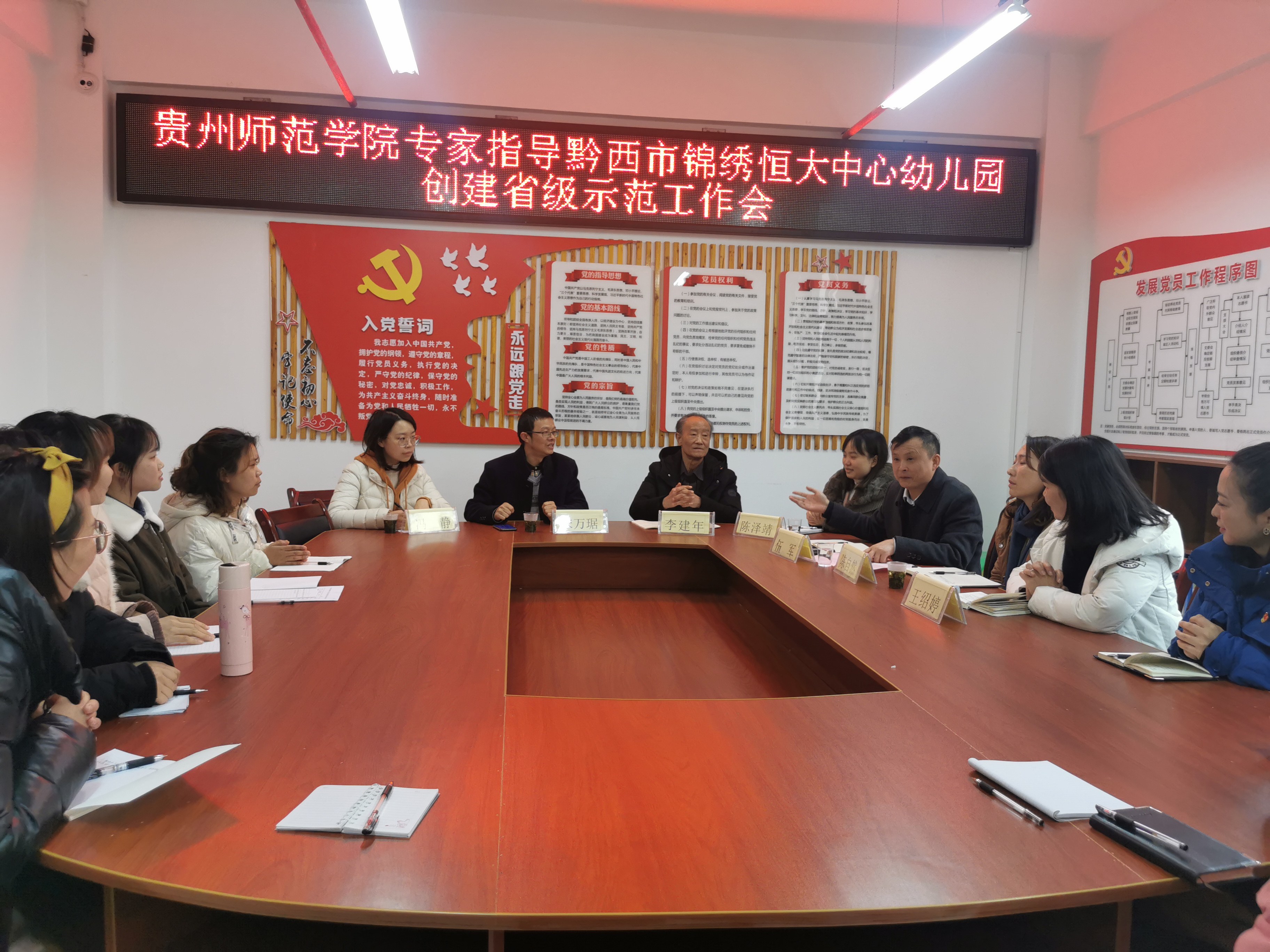 宋万琚院长、李建年老师、陈泽婧老师、冯静老师等一行四人前往黔西市锦绣恒大中心幼儿园,参加该园组织的“创建省级示范工作指导会”。参与会议的人员还有黔西市教育科技局学前教育质量中心主任伍军、黔西市学前教育质量中心教研员陈自然、黔西市锦绣恒大中心幼儿园园长王绍婷以及该园的全体主班教师等。
