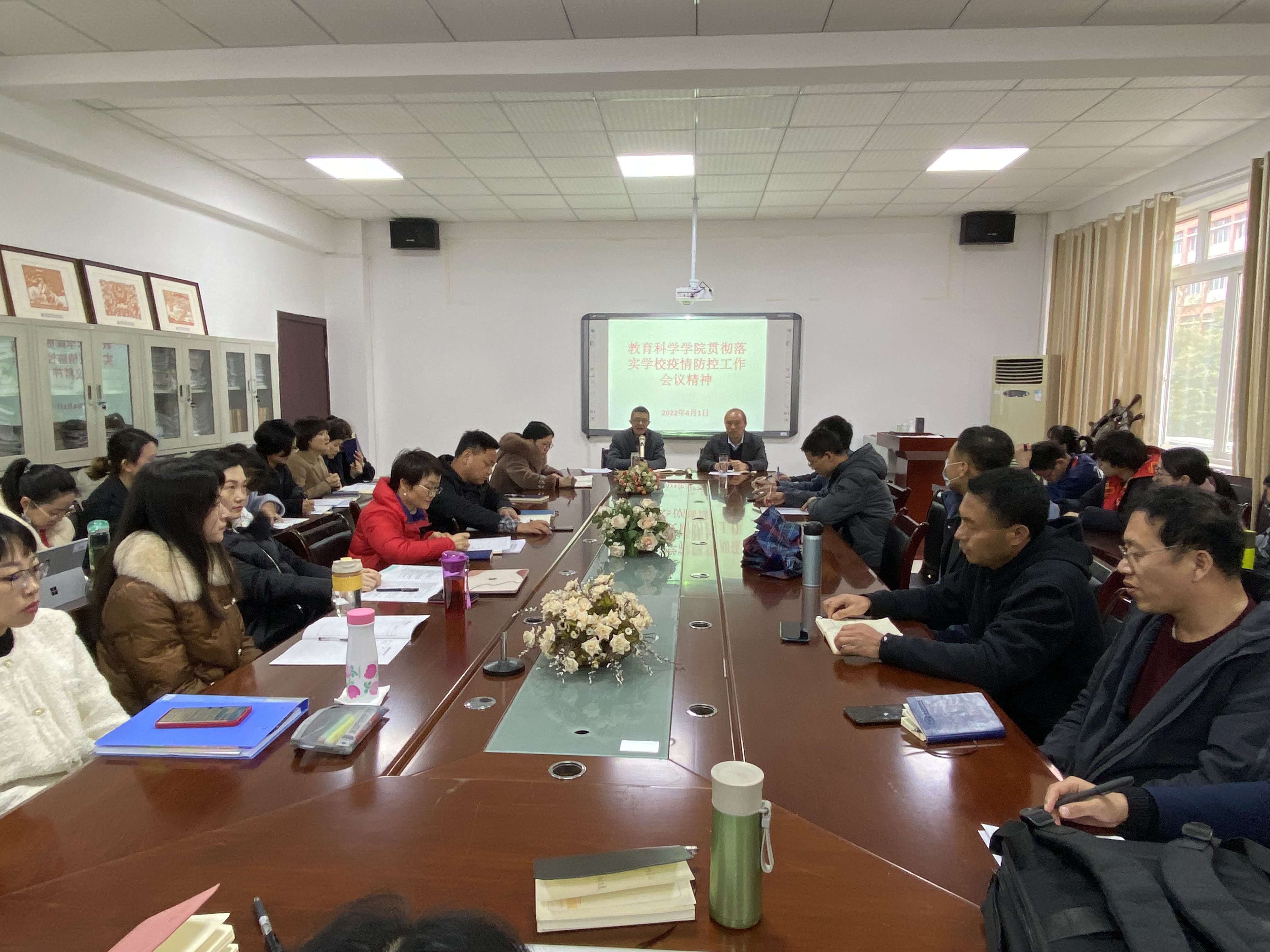 在会议室召开全体教职工会议,传达学校疫情防控工作会议精神,安排部署学院做好疫情防控工作,会议由院长宋万琚主持。