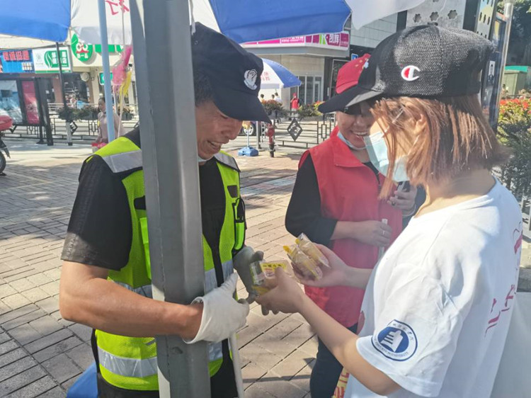 志愿者为文明向导员送去月饼