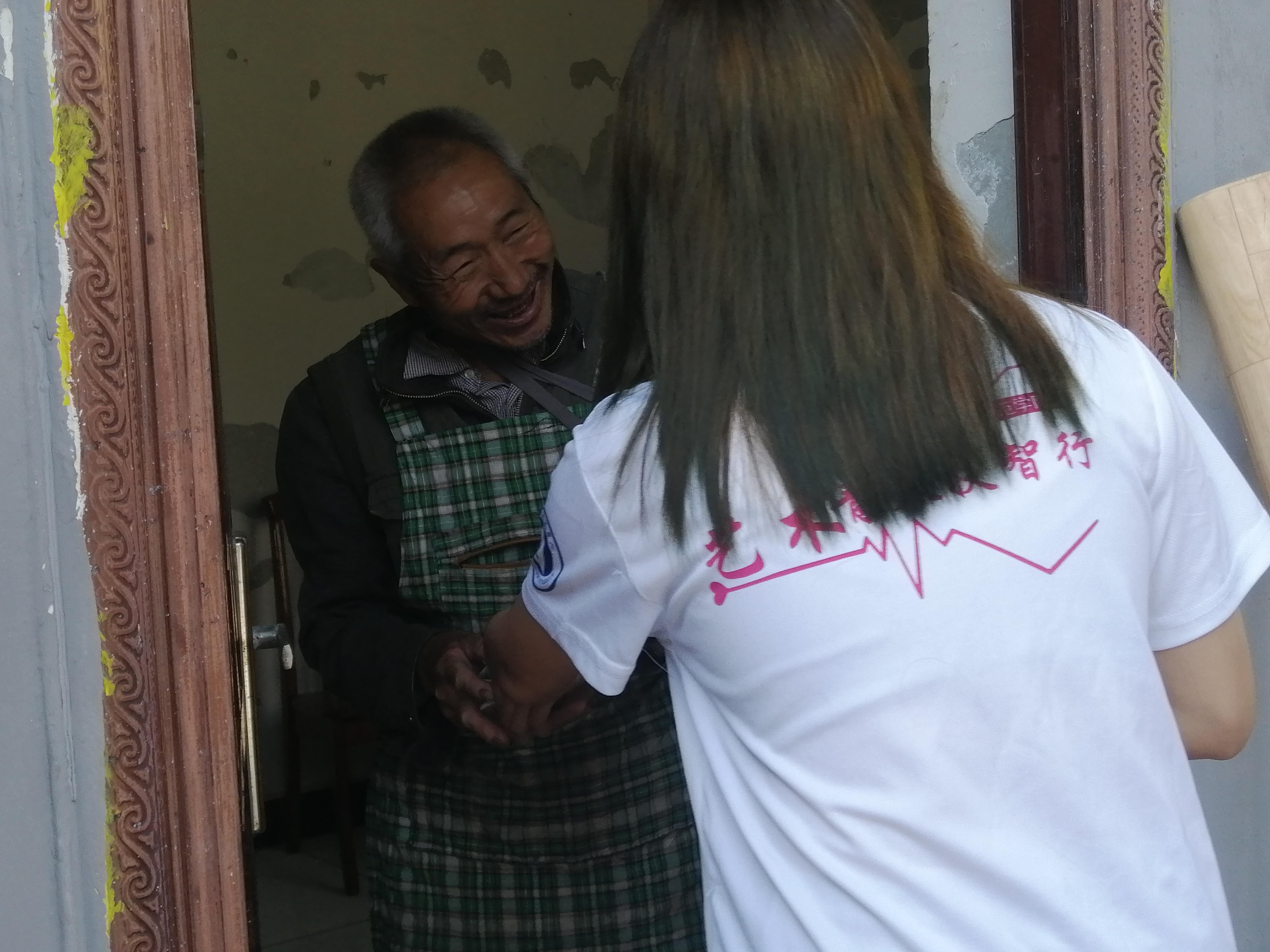 志愿者为拾荒老人送去月饼,老人露出了欣慰的笑容