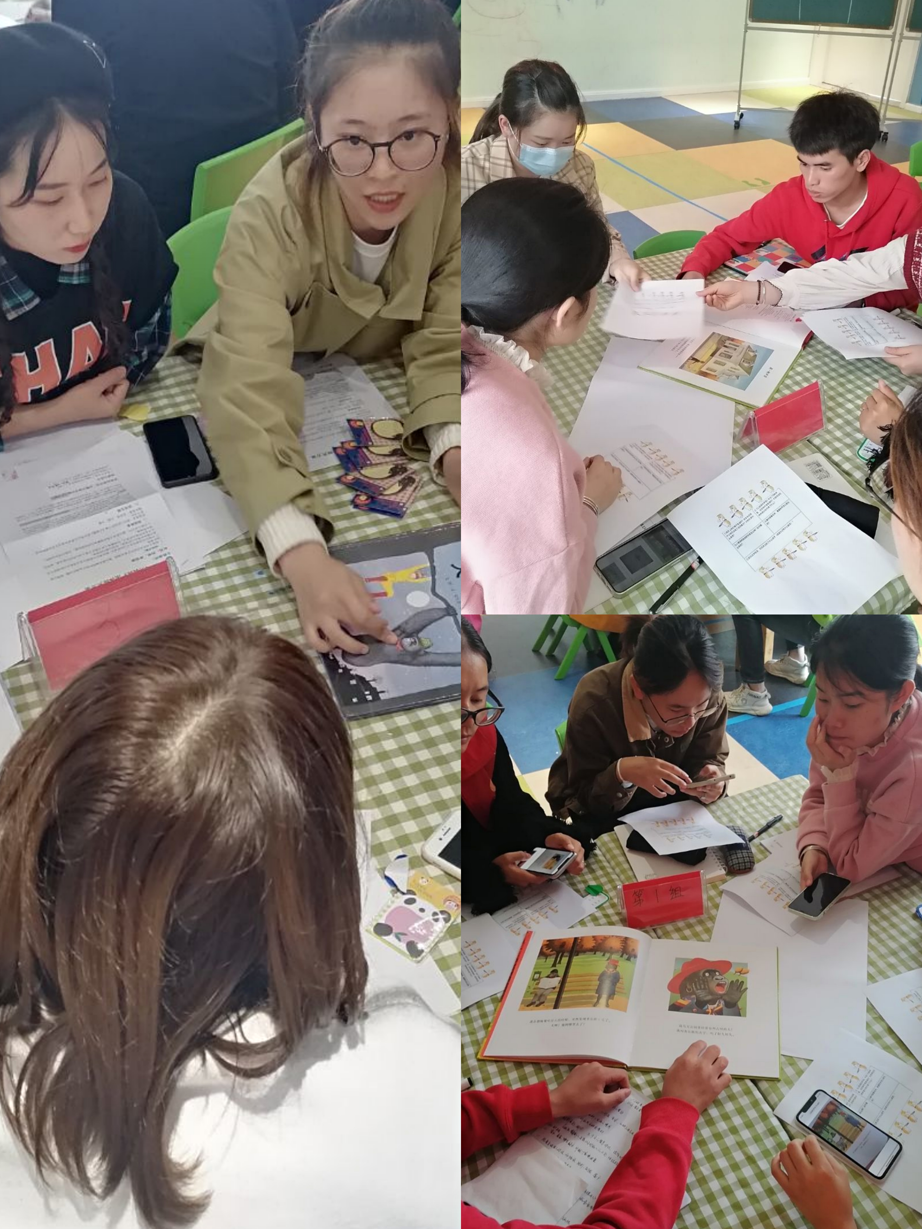 教研活动开始,进入安东尼·布朗的绘本《朱家故事》为背景的游戏时间,参加教研的人员在共建的微信群里接收到了一封来自作者的“挑战解密游戏”邀请函,继而19级学前熊红梦同学担任裁判宣读了游戏积分规则以及进行分组团建,现场一共分为五组,每组9人,每一组都由学生、家长和老师共同组成。解密游戏一共设置了三个关卡,每个关卡作者都会给出线索及总结语,在有趣和激烈的游戏氛围中,学生、老师和家长们逐渐达成对“绘本图片表现力”的感知、理解和表达与表现三个学习层次。接下来开展团体探究活动,其中三个组的团体探究设计和实施由19级学前专业李红锋、陈楠、郭奚言、向佑、周语涵、徐应敏、余婉婷同学负责,另外两个则由幼儿园老师负责。各组按照设计好的“团体探究”的方案对安东尼·布朗另外两本绘本《公园里的声音》、《大猩猩》的图片细节表现力进行研讨,并将产出呈现在提前设计好的背景纸上进行反思汇报,最后,罗婷老师进行了总结和拓展,并结合“基于批判性思维的‘5c’团体探究标准”对各个小组进行了点评。