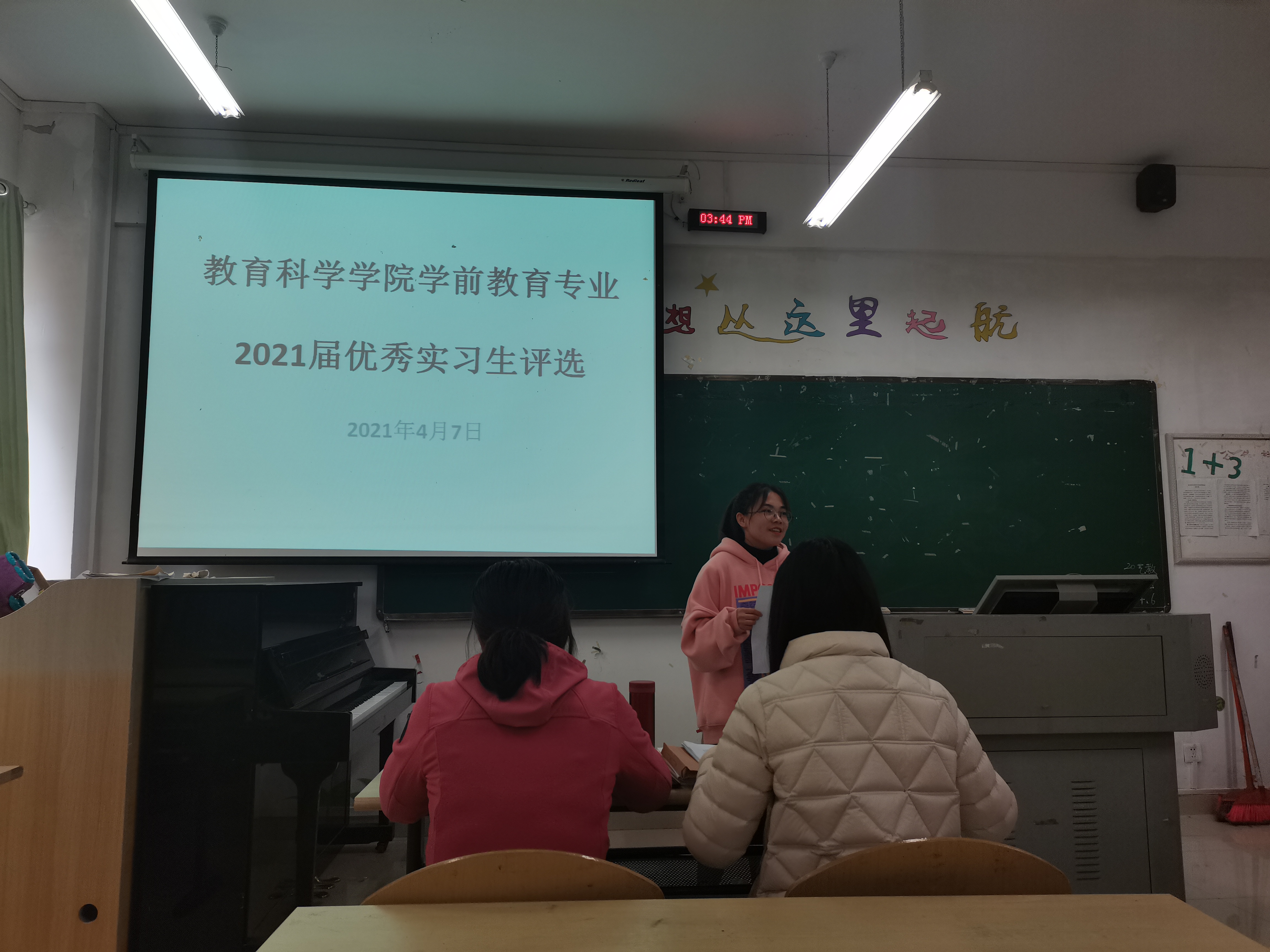 学前教育专业在逸夫楼514举行了2021届优秀实习生评选活动,此次活动的评委是学前教育系老师冯静、罗婷,学前教育专业2017级实习生参与此次评选,学前教育专业2018级全体同学到场观摩与学习。