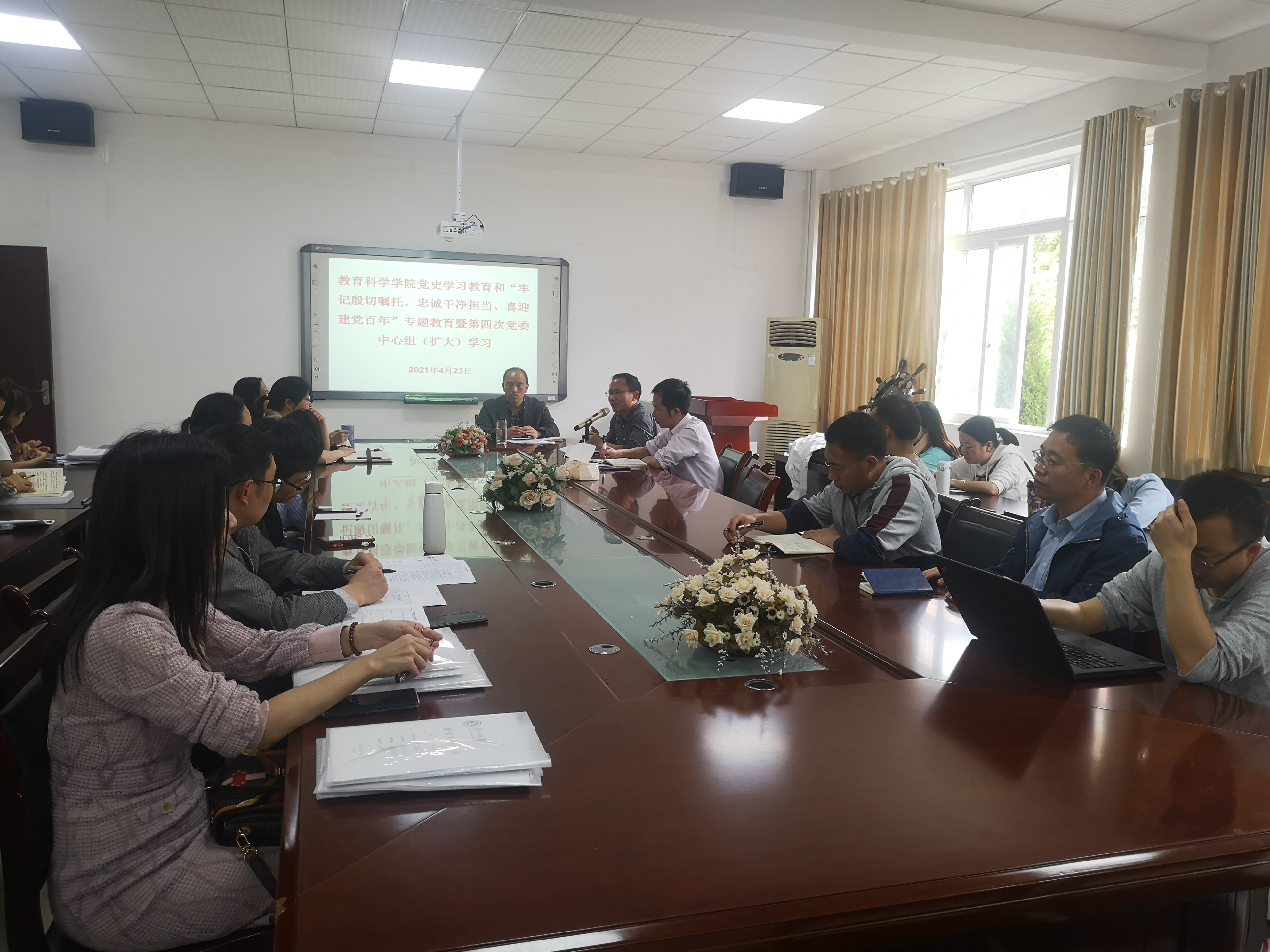 在逸夫楼学院会议室,举行党史学习教育和“牢记殷切嘱托、忠诚干净担当、喜迎建党百年”专题教育暨第四次党委中心组(扩大)学习,学院党委书记彭祥友主持学习,学院党委中心组成员,全体教师党员参加。