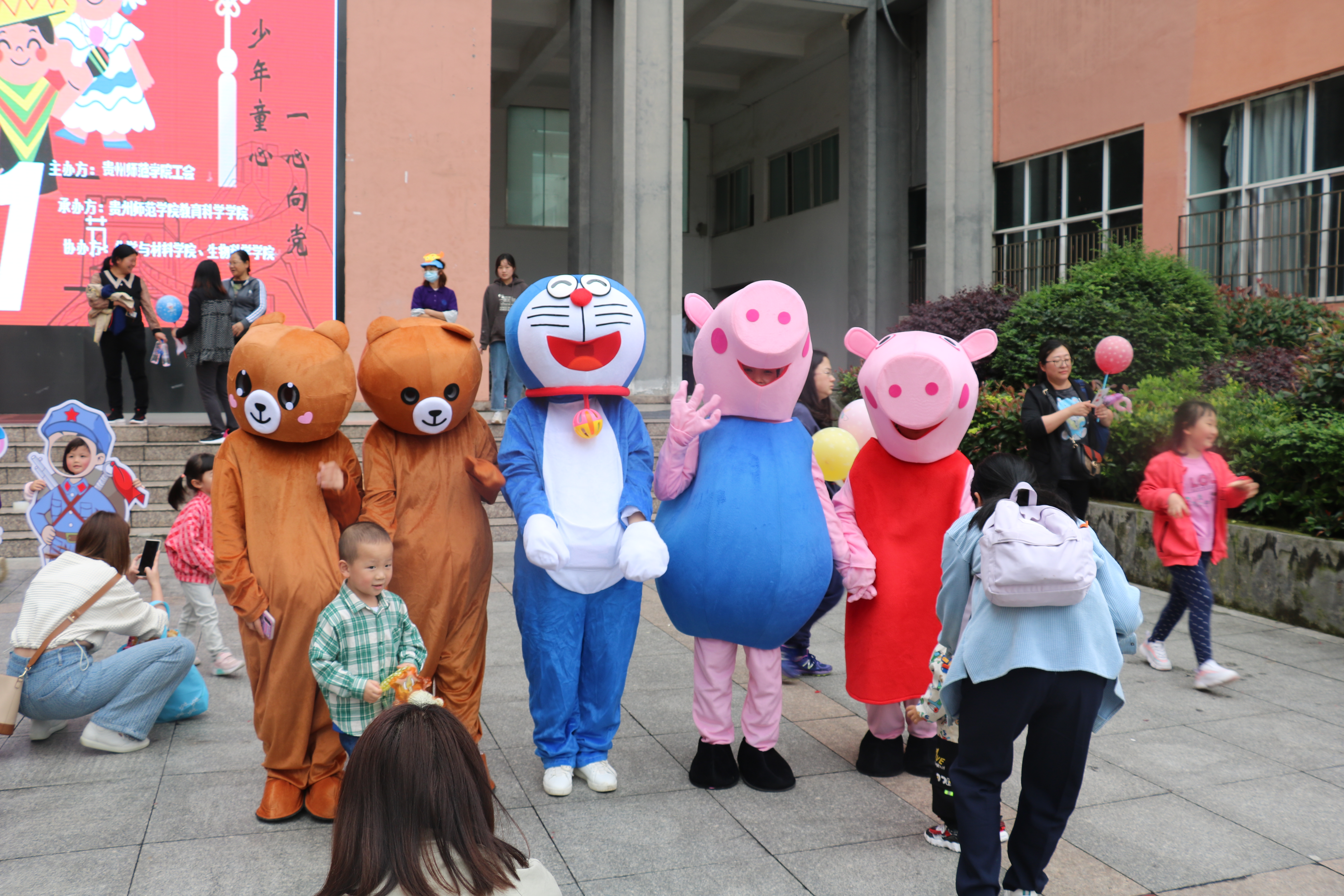 学前教育系学子带来的儿童剧《小英雄雨来》以及《王二小》火热上演!。特别是台上的演员们带动小朋友们进入剧情时,全场的气氛达到了高潮。同时,两个儿童剧中途,由花艺洋小朋友带来的《浏阳河》钢琴曲让家长与孩子们感受到了人民对家乡生活以及对毛主席的热爱,儿童剧结束后,学前教育系的工作人员提前准备好了满天星气球站于演播厅门口,待小朋友及家长们从演播厅出来后赠送给小朋友们,一个个炫彩夺目的满天星气球让小朋友们更是感受到了儿童节的欢乐。接着,在学前教育系工作人员和“哆啦A梦”、“佩奇”、 “乔治”等人偶的指引下,户外系列亲子活动正式展开。