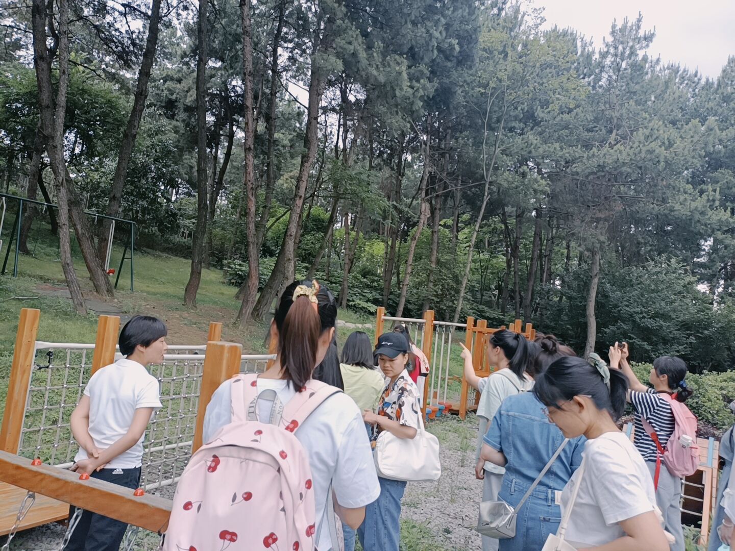 首先,幼儿园的张园长带领大家参观幼儿园,参观从幼儿园的户外环境开始。幸福学堂幼儿园位于双龙生态公园里,虽然幼儿园有一个围栏,但是张园长说在开展户外探索活动时,可以随时突破围栏,让孩子们有更广泛的空间去接触大自然,在自然中去探索,在自然中获得发展。紧接着开始参观幼儿园室内环境,进入室内,首先看见的是三个班的幼儿的书包、水杯及其他物品的放置处,干净整洁。幼儿园只有三个班级,每个班级10-15名幼儿,混龄教育,每个班两位老师,班级没有固定的教室,教师与幼儿之间的相处像家人一样,是平等尊重的关系。在教学模式上,张园长介绍,他们遵循的是自由、开放、平等、共同进步的教育理念,教育中鼓励幼儿发现自己、做自己、挖掘自己的潜力。教师可以在教育计划的基础上,根据幼儿需要和兴趣开展随机教学。在制定教育计划时会参考《3-6岁儿童学习发展指南》,也会开放实施五大领域的课程,在每个月月底时还会开展全园的活动。参观结束后,张园长让小班的薛老师和中班的毛老师与同学们进行了分享和交流。
