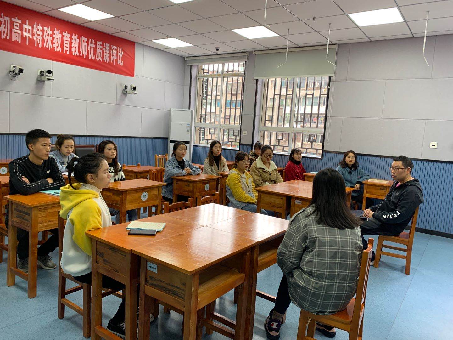 10月14日上午,贵州师范学院特教系2017级特殊教育专业教育实习前期检查暨基地校教学研讨活动于南明区启智学校开展。参与本次活动的人员有:贵州师范学院特教系杨娟老师、雷经国老师,南明区启智学校周丹副校长、教导主任和相关学科的教研室主任,在南明区启智学校实习的2017级特殊教育专业学生以及2018级特殊教育专业部分学生参与了本次基地校的教研活动和见习观摩。