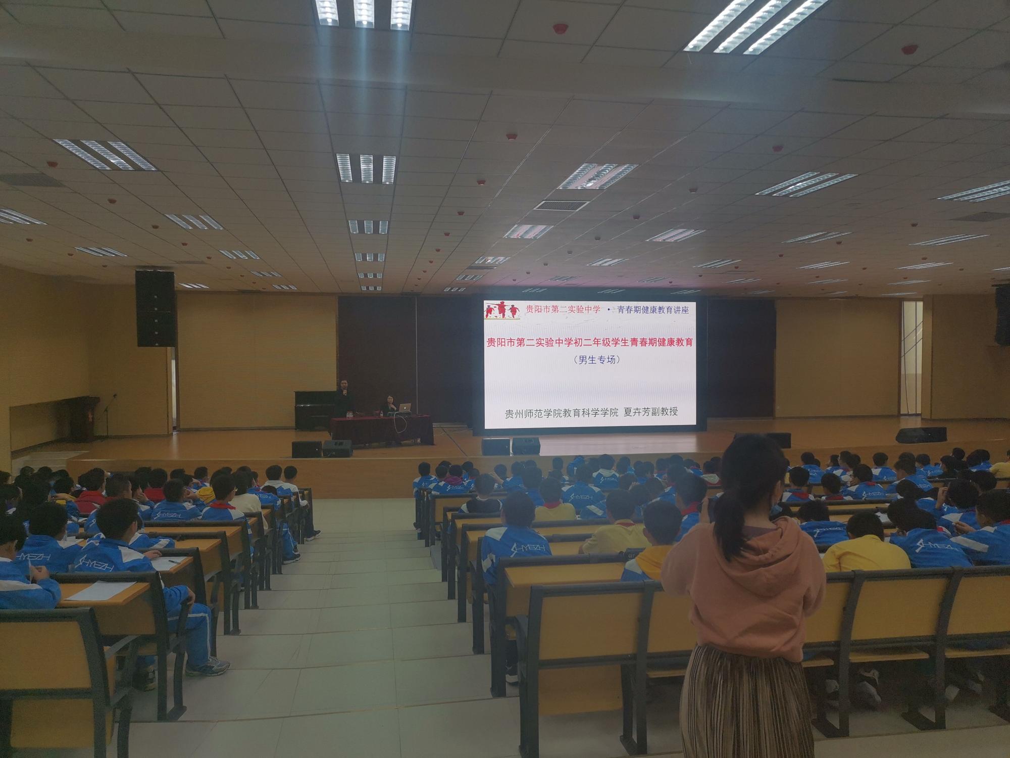 夏卉芳副教授受贵阳市第二实验中学邀请开展以“青春期健康教育”为主题的讲座,讲座分为男生专场和女生专场,培训学生近千人(998名学生)。