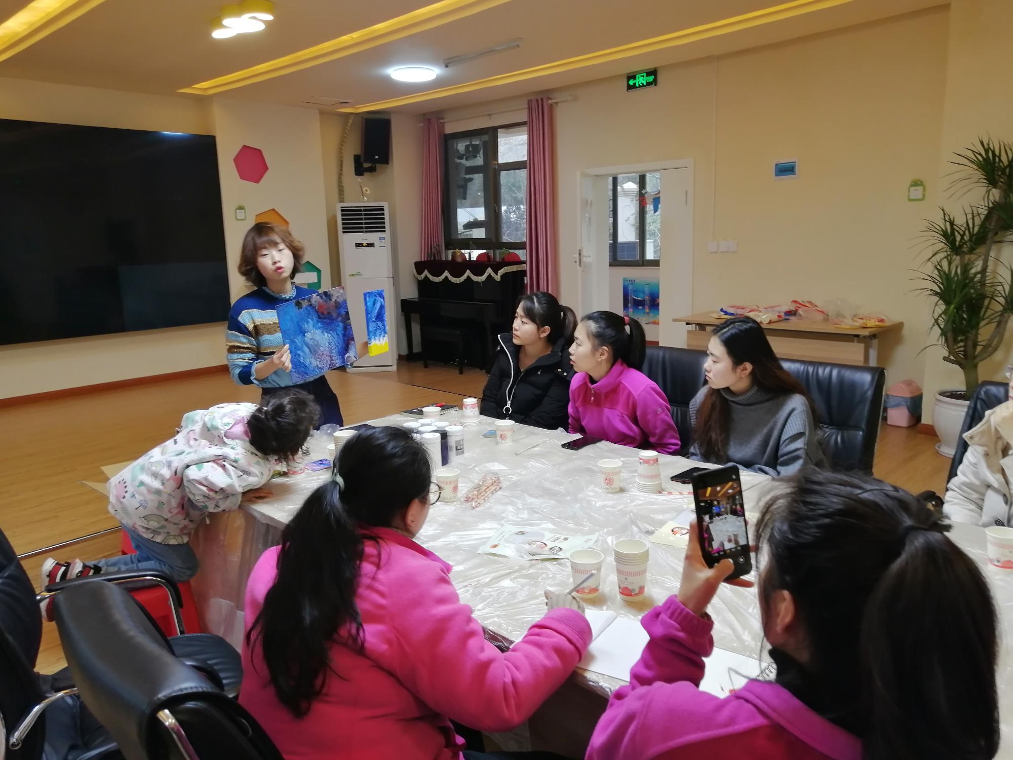 申利丽副教授到南明区后巢中心幼儿园为幼儿园教师进行了《创意流体画》培训。