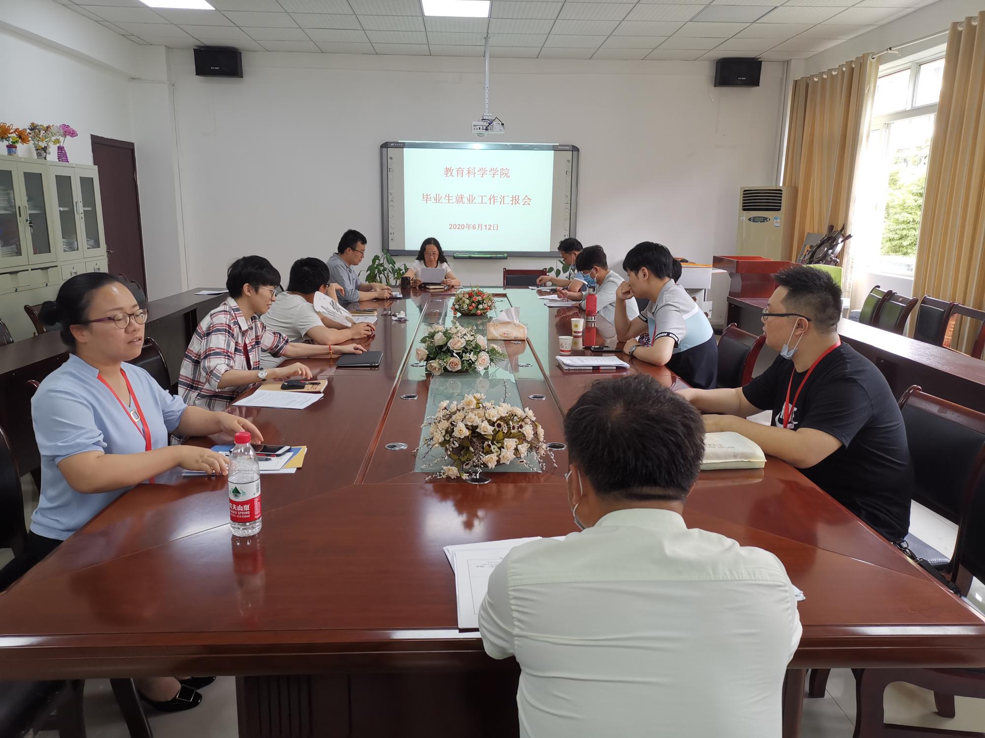 会议室举行,会议由院长刘红主持。刘红传达了6月10日在信息楼召开的贵州师范学院2020届毕业生就业工作推进会的会议精神,要求每个老师做好就业指导和帮扶。随后每一位老师汇报自己对接帮扶学生的就业的现状和存在的问题。刘红强调就业问题是目前现阶段最重要的问题,一定要按计划完成每个阶段学校的就业目标。