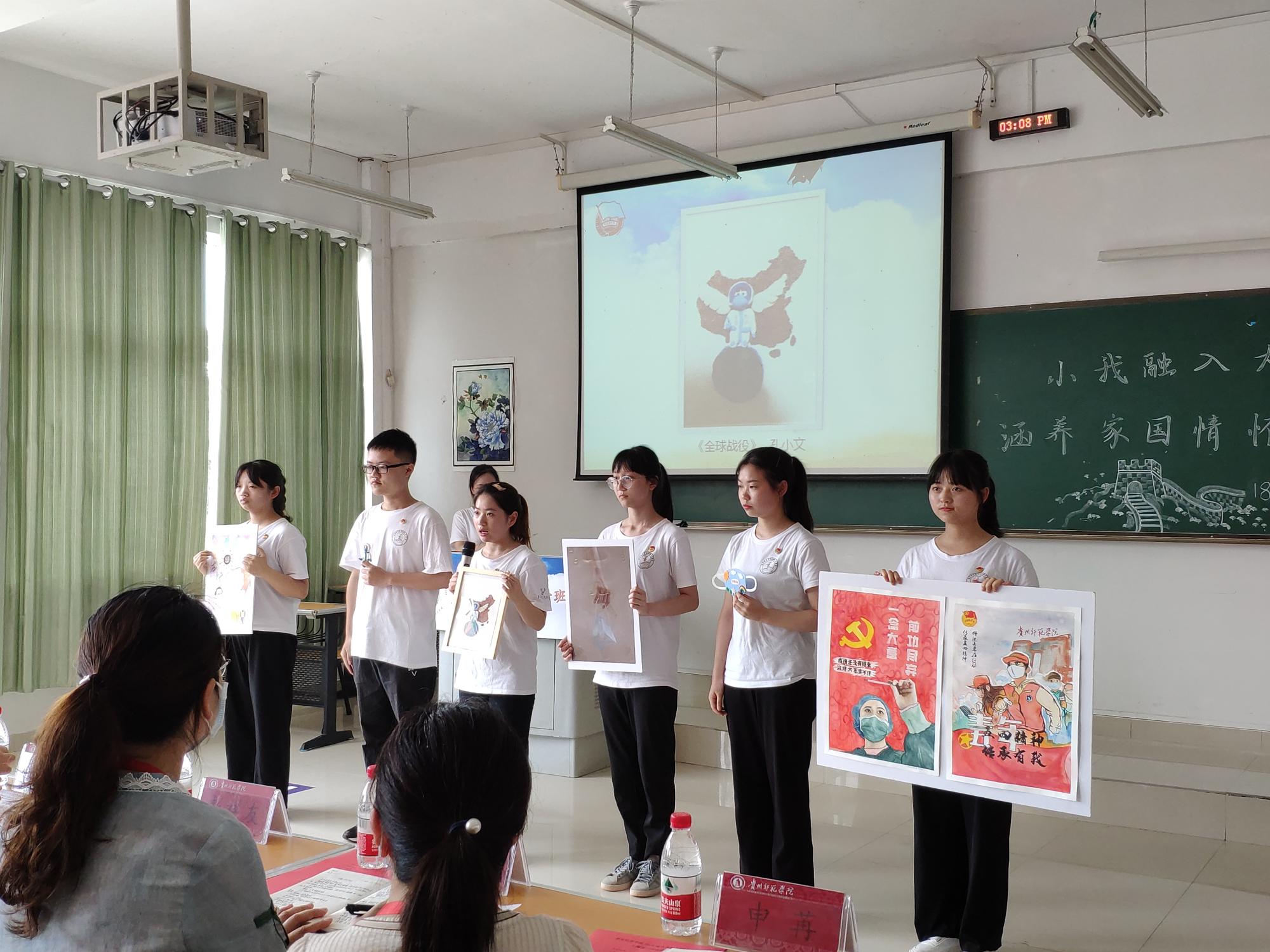 最后,贵州师范学院副校长郭文总结讲话,艺术教育的同学们充分发挥了自己的专业特长,用绘画、手工作品、音乐、摄影的形式来为前线的工作人员加油打气,为抗疫尽一份力,本次团日活动气氛也非常热烈,开展的十分成功。并通过切身体会向同学们提出了三点希望:一是希望同学们志存高远,涵养家国情怀。她提到,在2020年来临之际,我们国家,党,社会承受着巨大考验,但同时也感受到我们中国共产党的坚强领导,中国特色社会主义制度的优越性,全国人民众志成城,守望相助的的民主精神。青年智则国智,青年强则国强,中国的未来属于青年,中华民族的未来也属于青年,我们青年人要树立与这个时代主题同心同向的理想信念,更值国家情怀,勇于担当,这个时代赋予的历史责任,在激情奋斗中绽放青春光芒,健康成长进步。二是希望同学们求真务实,勇于创新发展,病毒期间众多感人事迹都表明,求真务实,勇于创新,既是一种精神状态、一种工作作风,也是一种工作方法。求真务实,勇于创新,就需要从实际出发,扎实工作,认真负责,打破常规,精益求精。无论是我们现在的学习,还是将来参加工作,我们都要科学规划,突出重点,抓住关键环节,敢于创新,提高效率,注重实际效果。三是加强自我管理,珍惜幸福生活。这次疫情改变了同学们的学习和生活方式,同学们要合理规划好自己的学习时间,制定学习计划,有规律,有节奏的学习,积极参与各项活动,提升自身的能力和综合素质,为将来服务社会,打下坚实基础。在生活中,我们是幸福的,我们应该珍惜现在的幸福生活,克服万难,不畏艰辛,圆满完成各项任务工作任务,与全国人民一道,打赢这场战“役”。