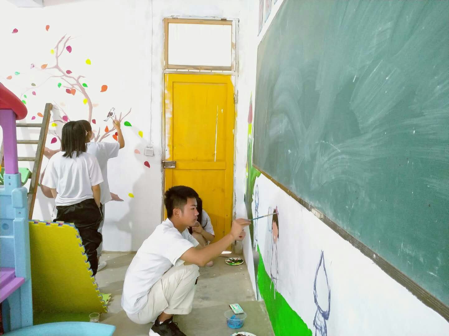 约·绘℃艺术公益社团的团队到达铜仁市德江县上堰村。6月15日早上,团队出发至上堰村幼儿园到需要绘制的墙面进行作画。此次活动分为搭梯子、勾框架、精细化三个环节,队员们分工合作,有的队员负责搭梯子,有的队员负责绘图,有的队员负责涂色。截至上午11:00,团队完成了搭梯子和勾框架两个部分的工作。接着,队员们开始拿起画笔在墙面上开始进行精细化绘画。经过一天的精雕细琢,社团的队员们完成了所有需绘制的墙面。最终漂亮的幼儿园墙画一一呈现在众人的面前。