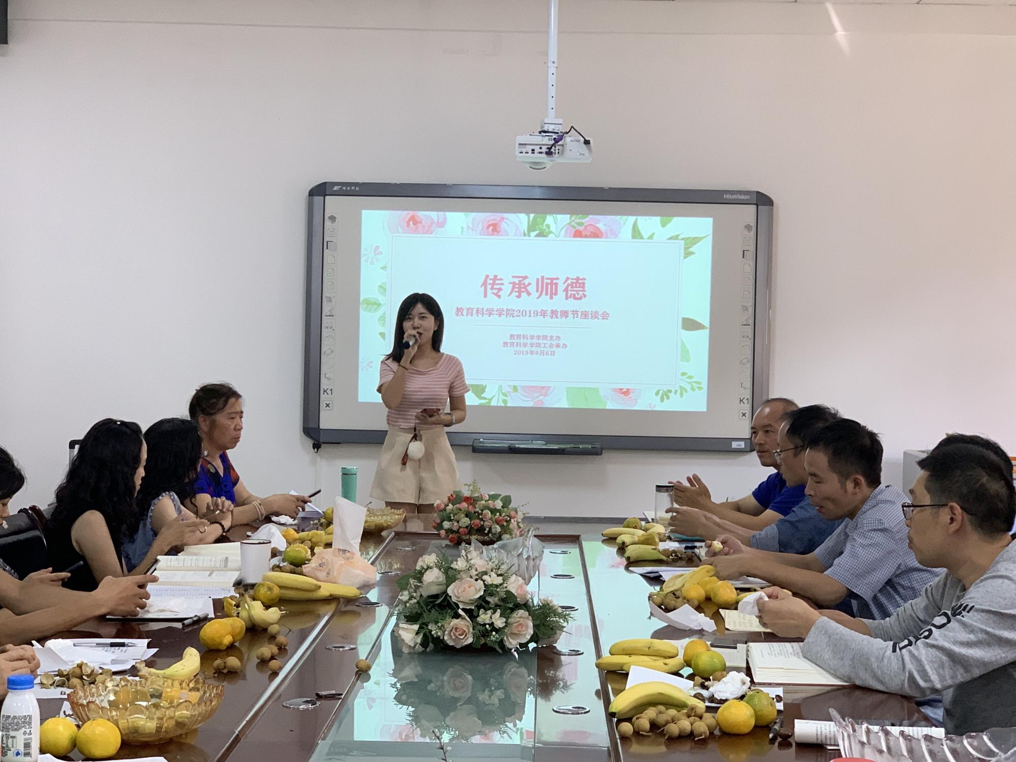 主办、学院工会承办的“传承师德”2019年教师节座谈会在逸夫楼3楼会议室举行。院党委书记彭祥友、院长刘红、副书记傅小芳、副院长黎平辉、副院长袁川出席座谈会,退休教师代表刘启艳教授及全院教师到场参加。座谈会由院工会主席主懿芹主持。