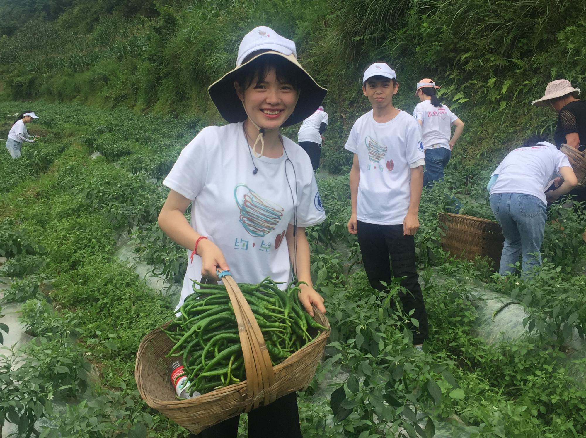 志愿者在辣椒基地采辣椒