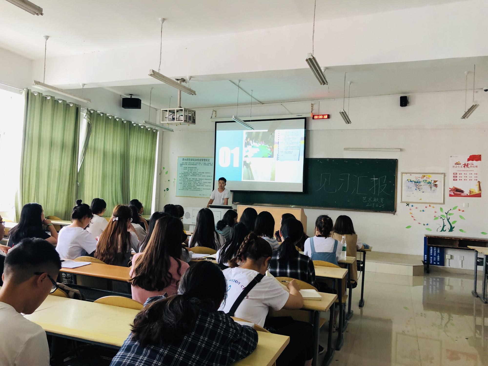 为了落实艺术教育专业人才培养方案,加强教学与一线小学实践的联系,提升学生的应用能力和见习质量,艺术教育系按照2018级见习方案开展了见习,见习时间为5月27日—31日(教学第十四周);见习主题为小学艺术课程初探、教学论课程;见习学生60人;见习小学4所,分别是:尚义路小学、新天一小、乌当区实验小学、新九学校,每所小学1位带队教师,15位同学。
