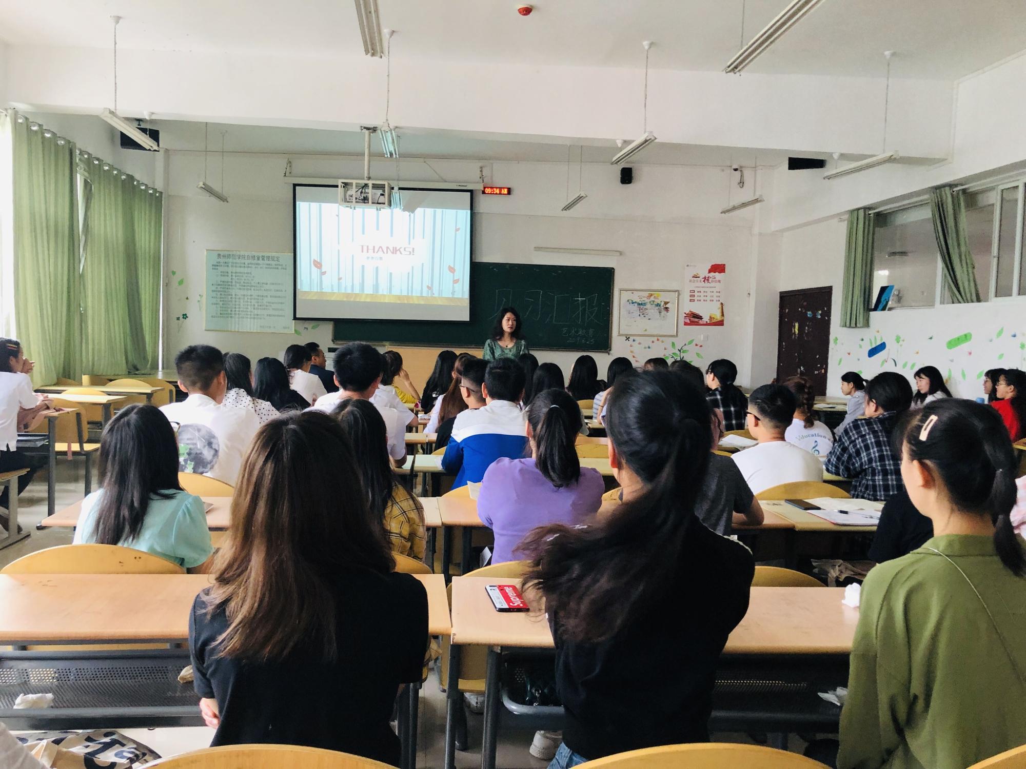 艺术教育系师生齐聚一堂,在逸夫楼604教室进行了本学期见习总结大会,系主任马慧慧以及申利丽、张怡、龙雪梅、莫太极、主懿芹参加了会议。