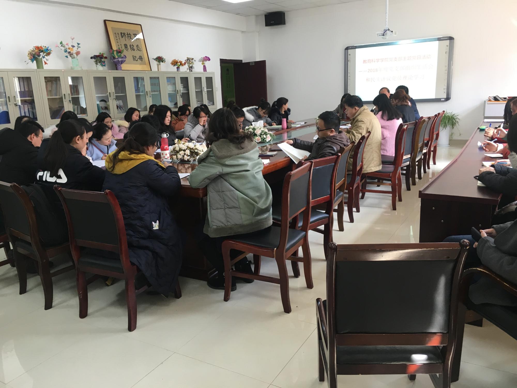 全体党员在学院会议室开展了党支部主题党日学习活动:2018年度组织生活会和民主评议党员理论学习,教师党支部书记李琴主持学习。