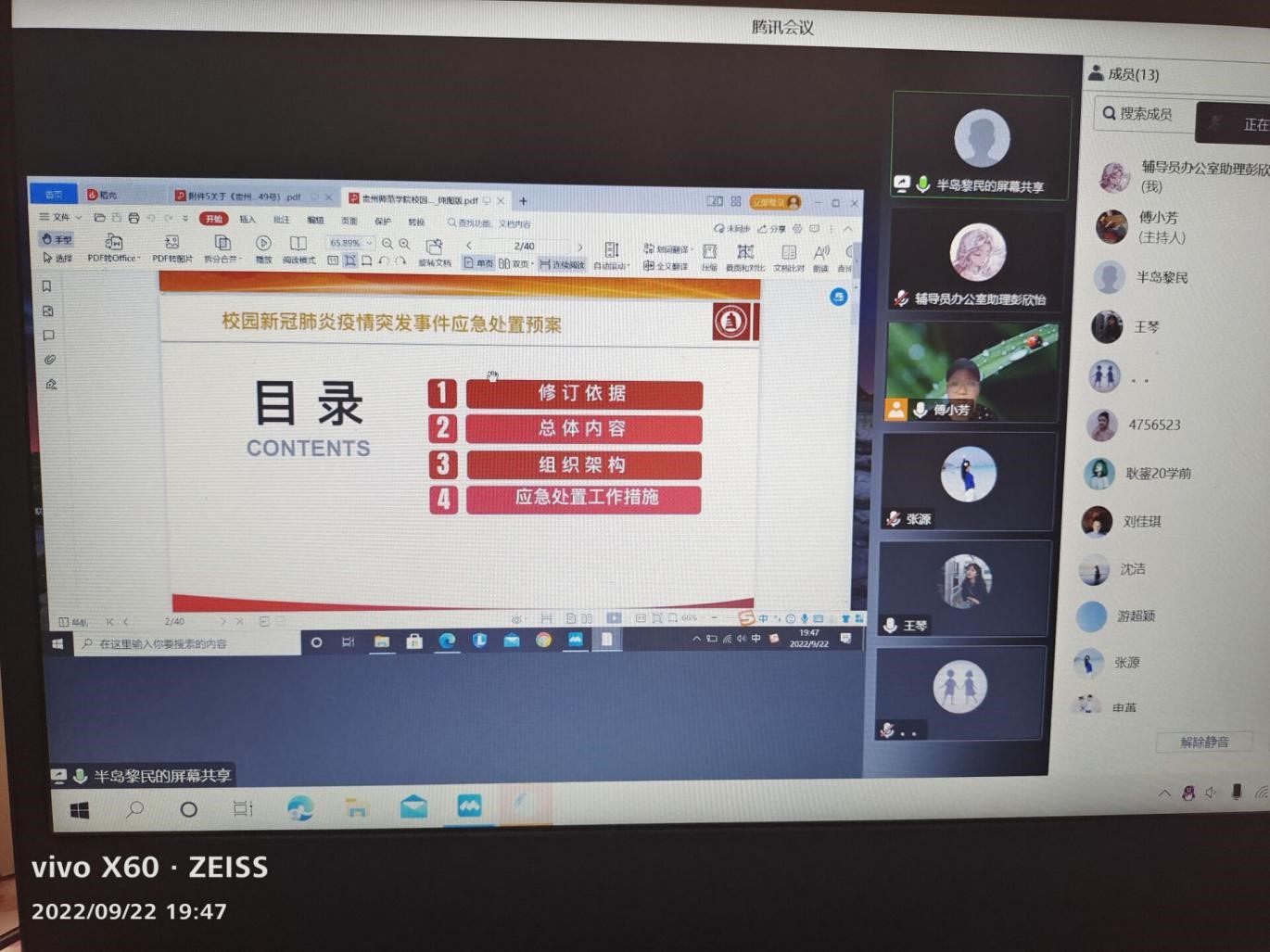 会上,张源对《新型冠状病毒感染防控方案(第九版)》和《高等学校新冠感染疫情防控技术方案(第六版)》的要求进行解读。接着,黎平辉副院长对《贵州师范学院校园新冠感染疫情突发事件应急处置预案》进行传达:一是介绍了相关工作的总体内容。二是介绍了应急情况处理的组织架构。三是介绍了应急处置工作的措施。最后,傅小芳传达《省教育厅 省纪委省监委派驻第十一纪检监察组关于学校疫情防控中违规违纪典型问题的通报》,要求全体学生管理人员、教育学生要遵守属地政府、学校的疫情防控要求,做好疫情防控各项工作。傅小芳对学院辅导员的工作表示崇高的敬意和衷心的感谢。辅导员要以学生的生命健康、安全为第一位,树牢安全的底线思维,做好疫情防控期间的各项学生管理工作。各辅导员通过线上线下会议,将疫情防控相关会议精神转达给每一位学生。