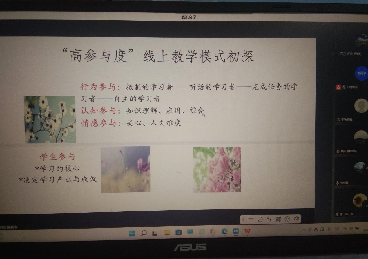 会议第二阶段,罗婷老师针对“高参与度”线上教学模式进行了经验分享,重点从“线上教学”优势、实际挑战(“唱独角戏”)两个方面进行阐述,并结合自身的实践经验对课程实施过程中运用的教学方法进行讲解,强调灵活运用好网络平台工具,有效提高课程的学生参与度。郑玉莲教授也结合个人的线上教学实践,对如何吸引学生参与线上课堂,提升学生专业认同度等方面分享了自己的宝贵经验。