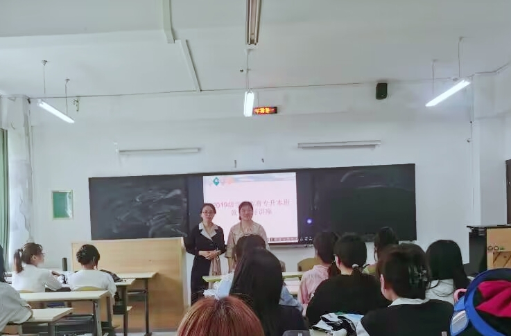 2019级学前教育专升本班在逸夫楼409教室召开“2019级学前教育专升本班召开就业指导讲座”。学院党委副书记傅小芳、辅导员游超颖和2019级学前教育专升本班全体同学参与了此次班会。本次讲座由傅小芳主讲。