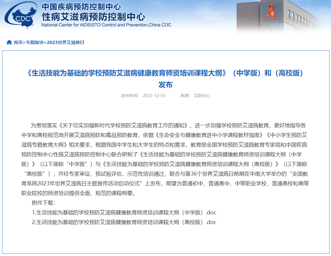 中国疾病预防控制中心发布《生活技能为基础的学校预防艾滋病健康教育师资培训课程大纲》(高校版和中学版)