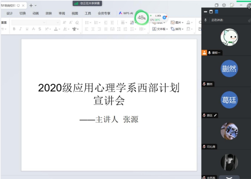 团委书记张源在线上为20级应用心理学班学生开展了西部计划宣讲会。宣讲会由张源主持。