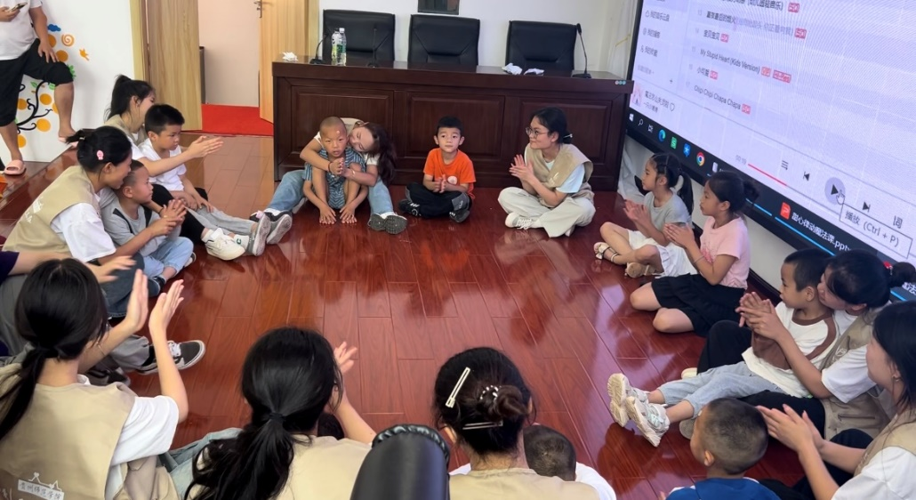 志愿者带小朋友玩击鼓传花