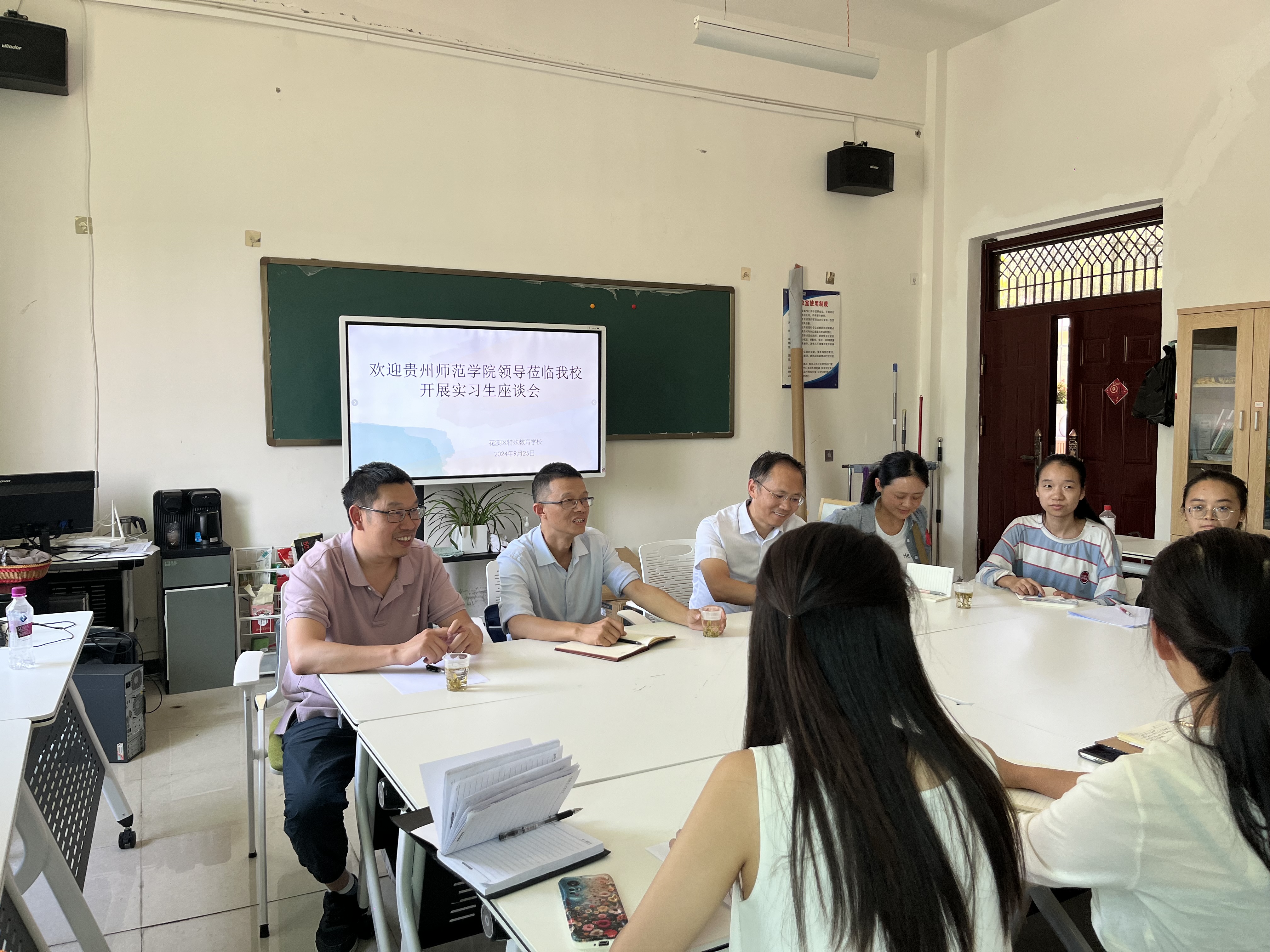 院长宋万琚、副院长黎平辉、特殊教育系主任雷经国、教师杨曼前往贵阳市花溪区特殊教育学校看望蒙莎、田洪琴等四位实习生,了解学生在实习单位的适应情况与实习任务完成进度。