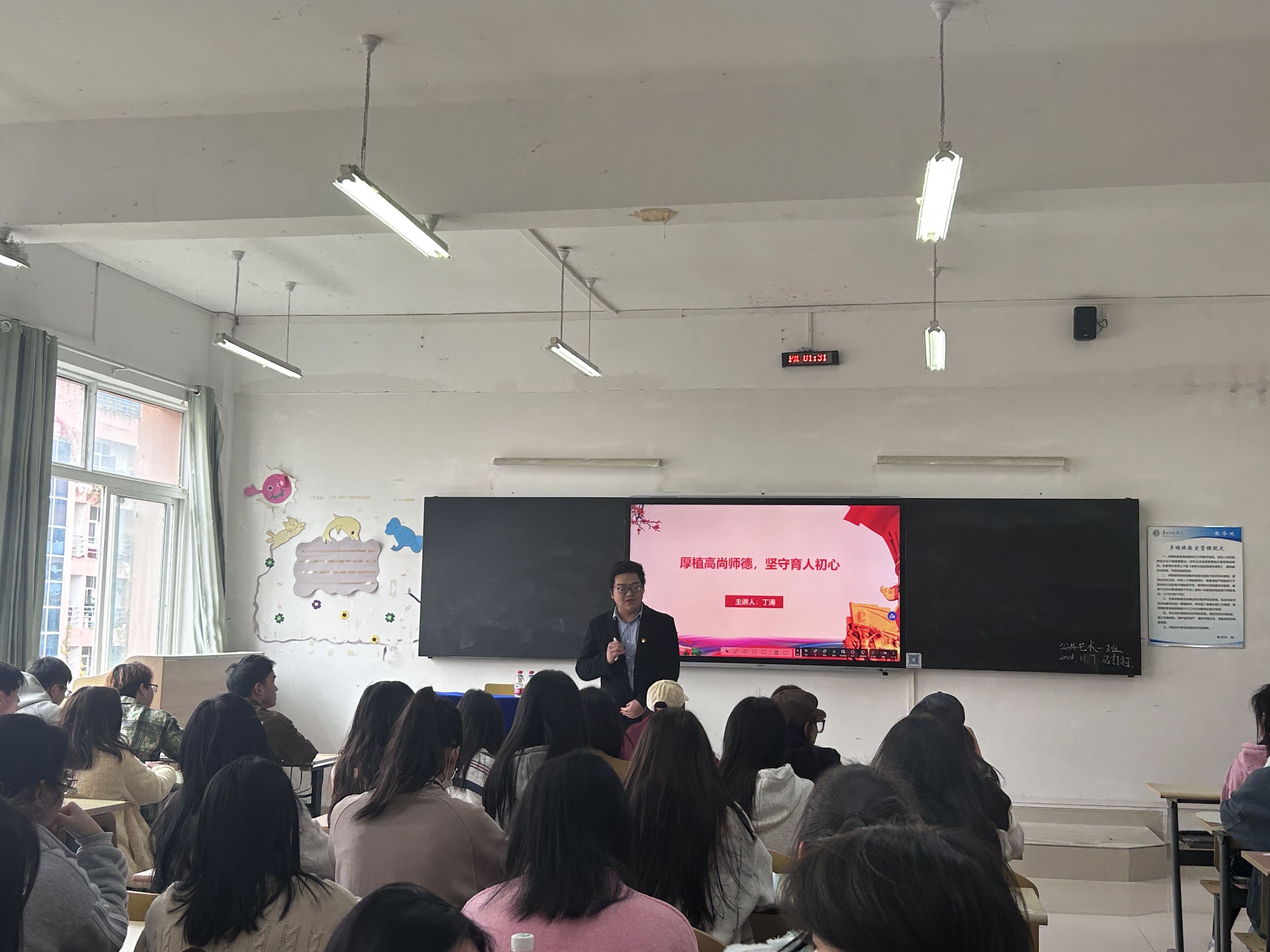 活动中,特别邀请了贵州省乡村名师、修文县县管专家、修文县六广镇幼儿园园长丁涛进行专题讲座。丁涛围绕“厚植高尚师德,坚守育人初心”的主题,从新时代党的教育方针出发,结合自己多年的教学经验和教育案例,深入浅出地阐述了高尚师德对学生成长的重要性。他提到,教师的言行举止、价值观念都会对同学们产生深远的影响,因此,每一位教师都应当时刻保持警醒,不断提升自己的师德水平,为学生的全面发展创造良好的教育环境。此外,丁涛老师还以七一勋章获得者张桂梅老师躬耕教坛的事例鼓励学生要以之为榜样,未来能在平淡的生活中坚守,在繁重的工作中持之以恒。丁涛老师希望同学们能遵从“六个下功夫”原则,坚定政治方向,自觉爱国守法,传播优秀文化,潜心培幼育人,秉持公平诚信,坚守廉洁自律,在以后的教育职业道路上,更好地履行育人职责,为培养德智体美劳全面发展的社会主义建设者和接班人贡献力量。