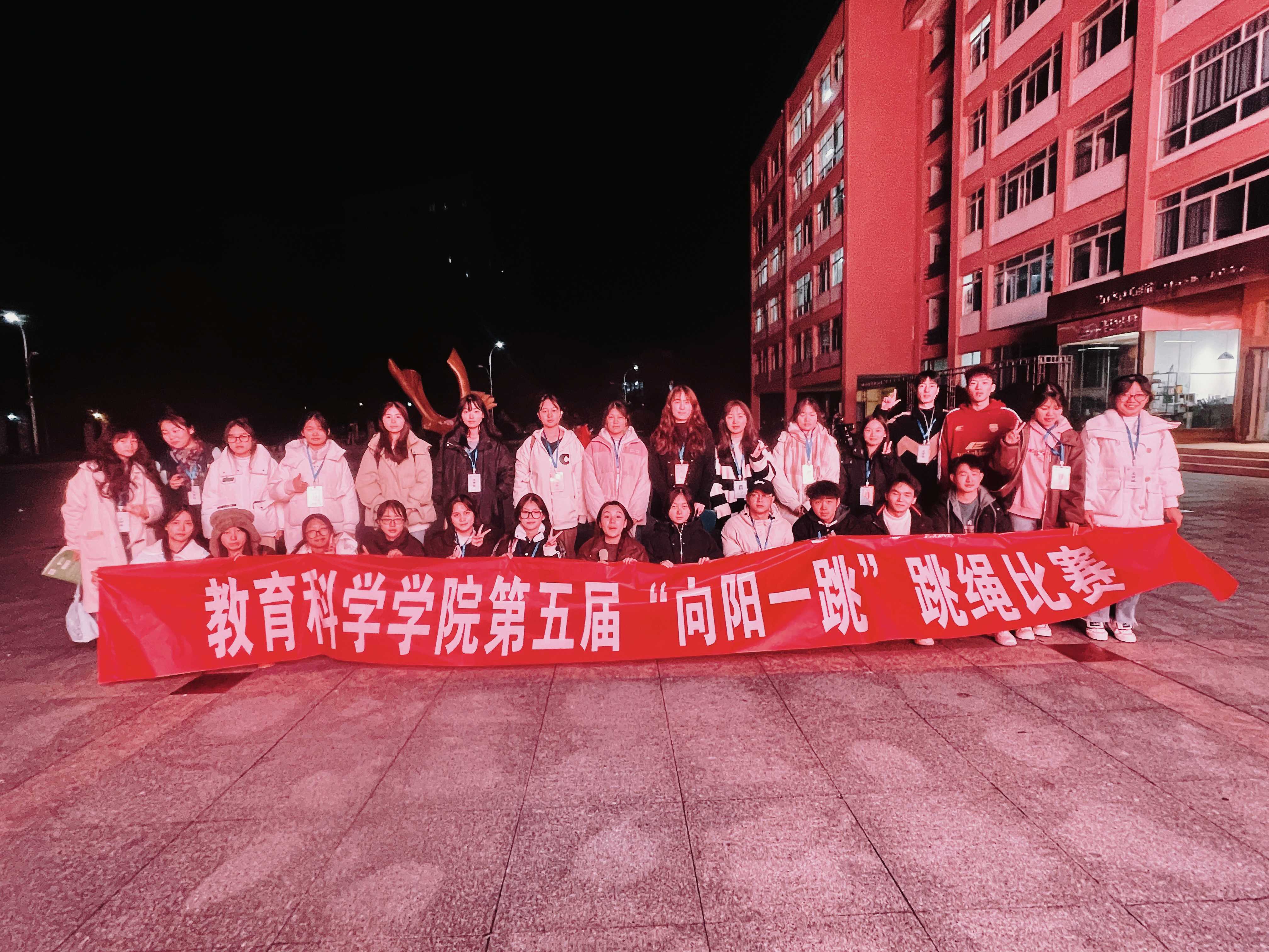 第五届“向阳一跳”跳绳比赛正式开始,随着裁判的一声哨响,摇绳的同学即刻开始双臂有力地挥动,跳绳的同学们排成整齐的队伍,呈“八字型”跳进与跳出。他们的动作协调一致,各班级代表队配合的也非常的默契,团体跳绳比赛将现场气氛推向了高潮。现场观众的加油助威声此起彼伏,而每一次成功的跳跃都凝聚着团队成员间的信任与协作。在这两分钟的比赛时间里,各班级代表队全力以赴,为了班级荣誉而拼搏。其中也不乏有小失误出现,但同学们相互鼓励,迅速调整状态,继续投入比赛,这种团结友爱的精神令人动容。最后,全体团委学生会成员及工作人员进行合影留恋。
