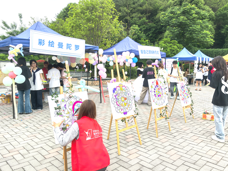 活动伊始,彩绘曼陀罗环节率先拉开帷幕。作为一种经典的表达性艺术治疗方式,曼陀罗绘画能有效舒缓压力、探索内心。现场摆放着大幅未完成的曼陀罗基底画布,来自不同学院的同学依次上前,每人仅负责绘制图案的一小部分,完成后便将画笔传递给下一位参与者。同学们充分发挥想象力,有人用明亮色彩勾勒花纹,有人用细腻笔触填充图案。随着越来越多同学接力创作,原本单调的图案逐渐变得绚丽多彩、层次丰富。每一笔色彩都是个体情绪与创意的独特表达,而不同风格笔触的自然衔接,又恰似人与人心灵的奇妙碰撞,诠释着包容与融合之美。