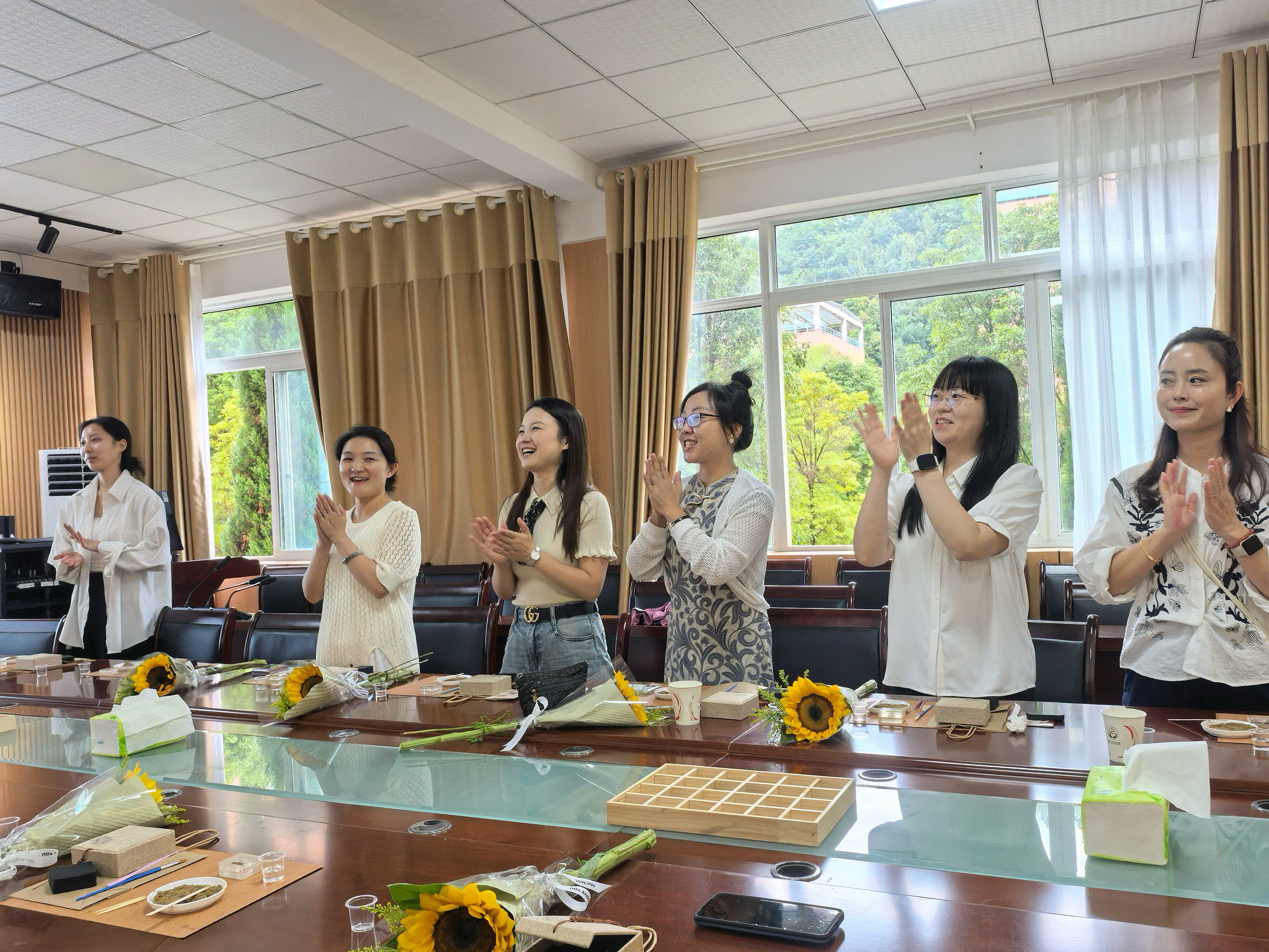活动现场花香四溢、笑语盈盈。桌面上整齐摆放着制作中药手串的材料,教师们在轻松愉快的氛围中动手穿制,一颗颗散发着淡淡药香的珠子在手中串联,不仅寓意健康平安,也寄托了大家对工作与生活的美好祝愿。与此同时,同学们为老师们送上鲜艳的向日葵,并送上对老师们节日快乐的真诚祝福。