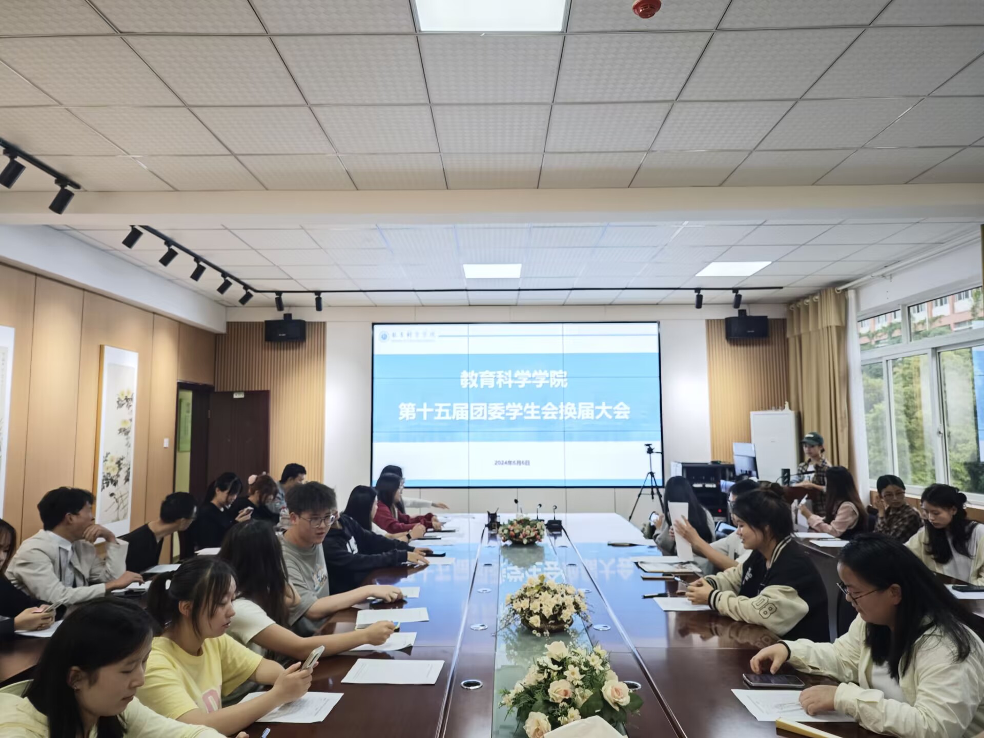 学生会在逸夫楼会议室举行了换届大会,院团委书记张源、工会主席主懿芹,以及全体团委学生会成员,本次仪式由第十五届学生会主席杨诗韵主持。
