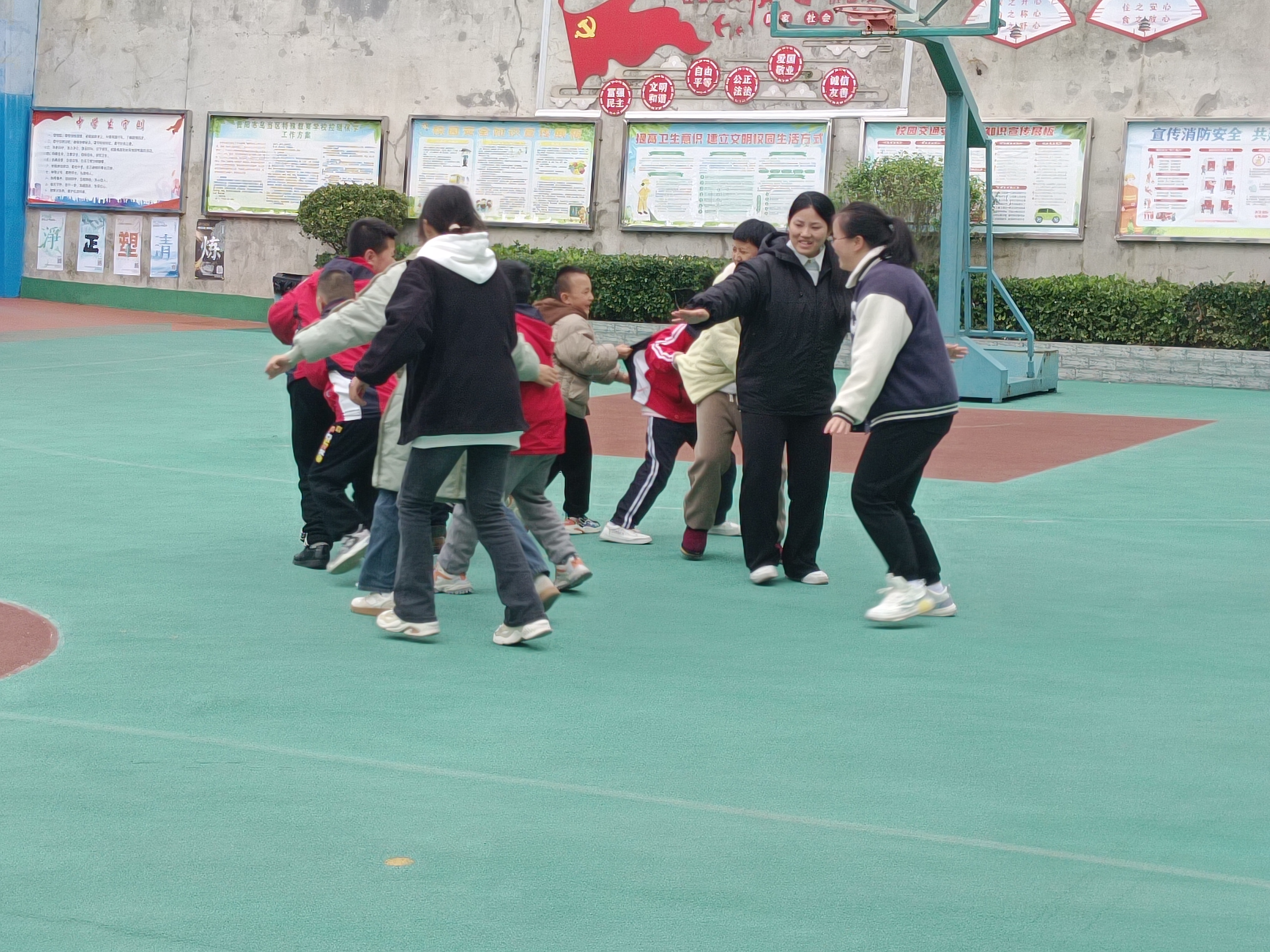 活动开始由主讲同学给小朋友们介绍活动的主题,随后志愿者们简单的自我介绍并进行一对一结对帮扶。当音乐响起,志愿者们纷纷带着各自的小朋友做起手指操暖场,调动着小朋友们的情绪,在手指操过后,一起在操场上开展老鹰捉小鸡的游戏。为避免小朋友人数过多,游戏分为了两组,既保证了安全,又保证了每个人的参与,在游戏中,每个小朋友脸上都洋溢着笑脸。