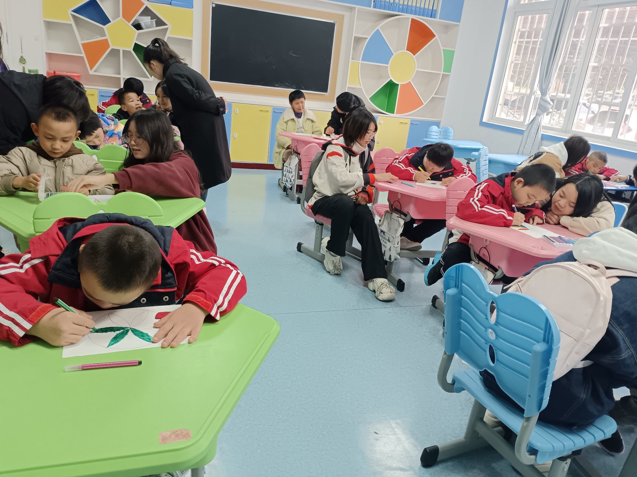 游戏过后,每个志愿者都陪在各自的小朋友身边,指导着小朋友们进行曼陀罗绘画,每个小朋友都认真专注的去画画。画完后大家都与各自的小朋友们拍照留念。活动最后在互相道别中圆满的结束。
