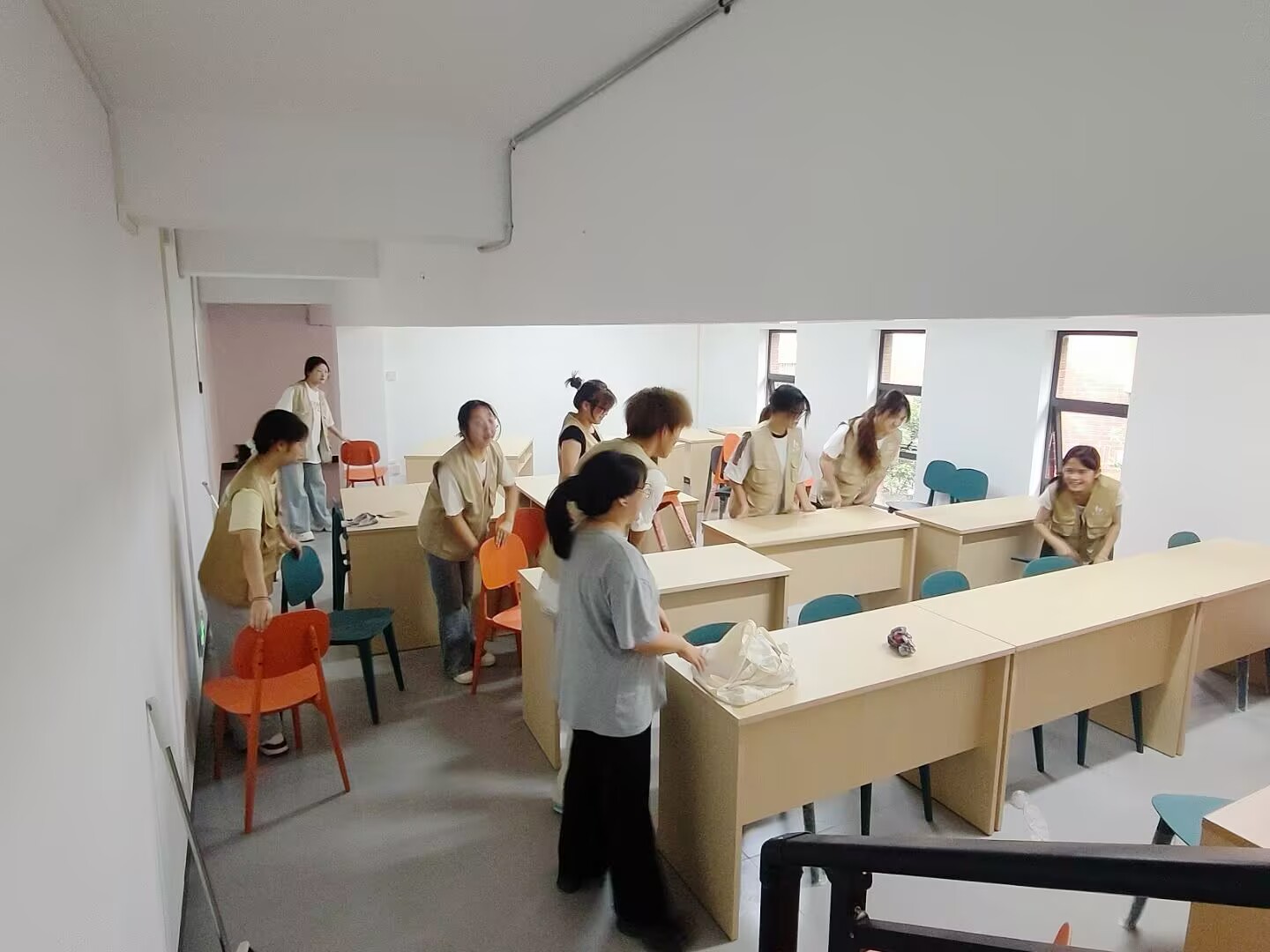 此次团队选择该站点作为实践基地,聚焦随迁子女群体,将专业所学融入社会实践,充分体现了大学生服务社会、关爱儿童的责任担当。活动首日,实践团队迅速进入状态。指导教师张源首先对全体队员进行了工作部署,强调了活动意义、安全纪律以及服务过程中的注意事项,要求大家以高度的责任感和饱满的热情投入实践。随后,队员们齐心协力,对益童乐园的活动场地进行了细致的打扫与布置,营造出更加整洁、温馨的环境,为后续活动的开展做好准备。接着,团队成员与益童乐园贵阳云岩站点的负责人李小露进行了深入交流与沟通。双方就本次“三下乡”社会实践活动的具体内容、课程安排以及预期目标等细节展开了务实而高效的讨论。最后经过充分协商,顺利确定了后续活动的详细流程和实施方案,为未来一段时间的精准服务奠定了坚实基础。