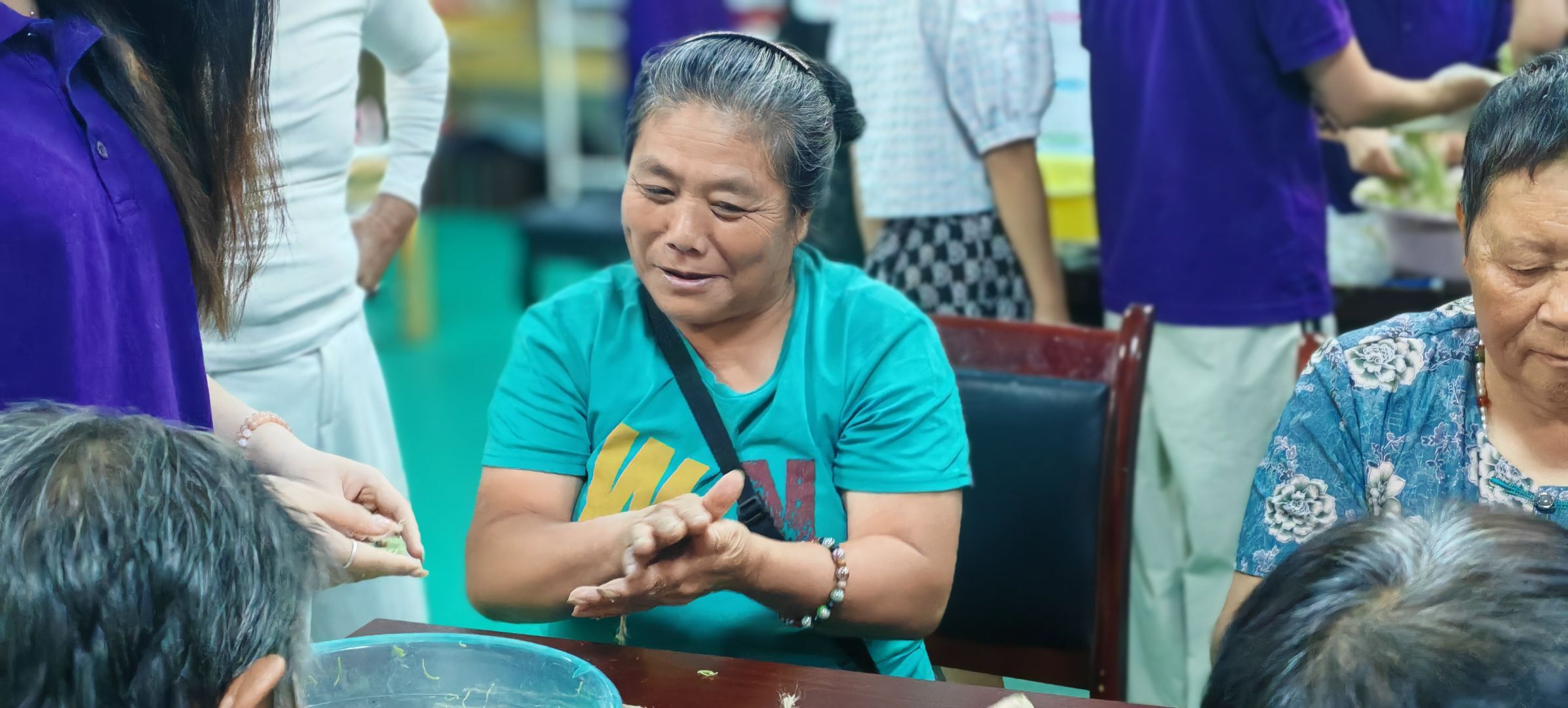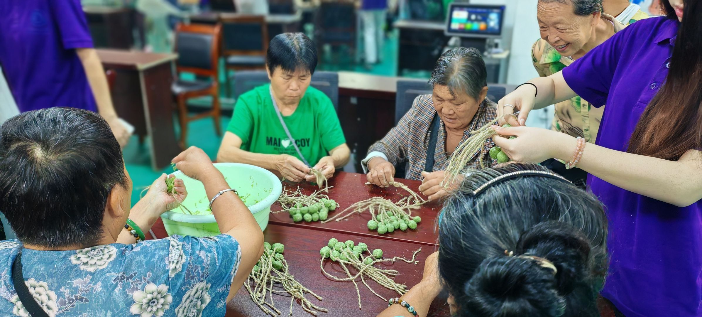的童心绘梦志愿服务队的志愿者们与社区数位银发长者和残障人士围坐一堂,指尖翻飞间,一块块晶莹别致、散发着清甜果香的手工葡萄皂逐渐成型。