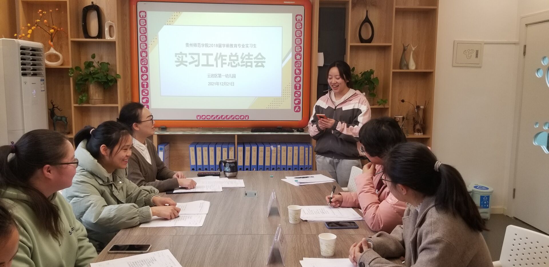 本次总结会由云岩区第一幼儿园实习指导教师刘义主持。会议伊始,实习生们各自就自己一个学期的实习成果进行汇报,学院实习指导老师及幼儿园实习指导老师对学生们的授课进行了点评。