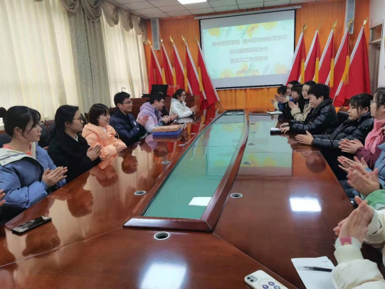 其次,安文军老师代表8名实习生对播州区特殊教育学校给予实习生实习指导工作表示衷心的感谢。最后,杨启勇校长对会议进行总结。杨校长首先对贵州师范学院特殊教育系对播州区特殊教育学校工作的大力支持表示感谢,对实习生的实习态度给予肯定和表扬,并希望继续加强两校合作。