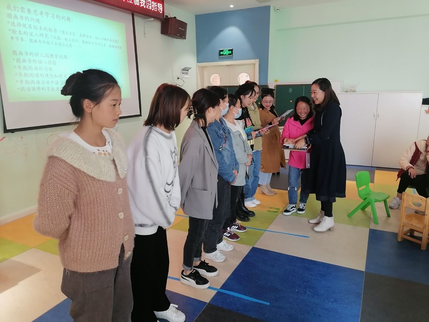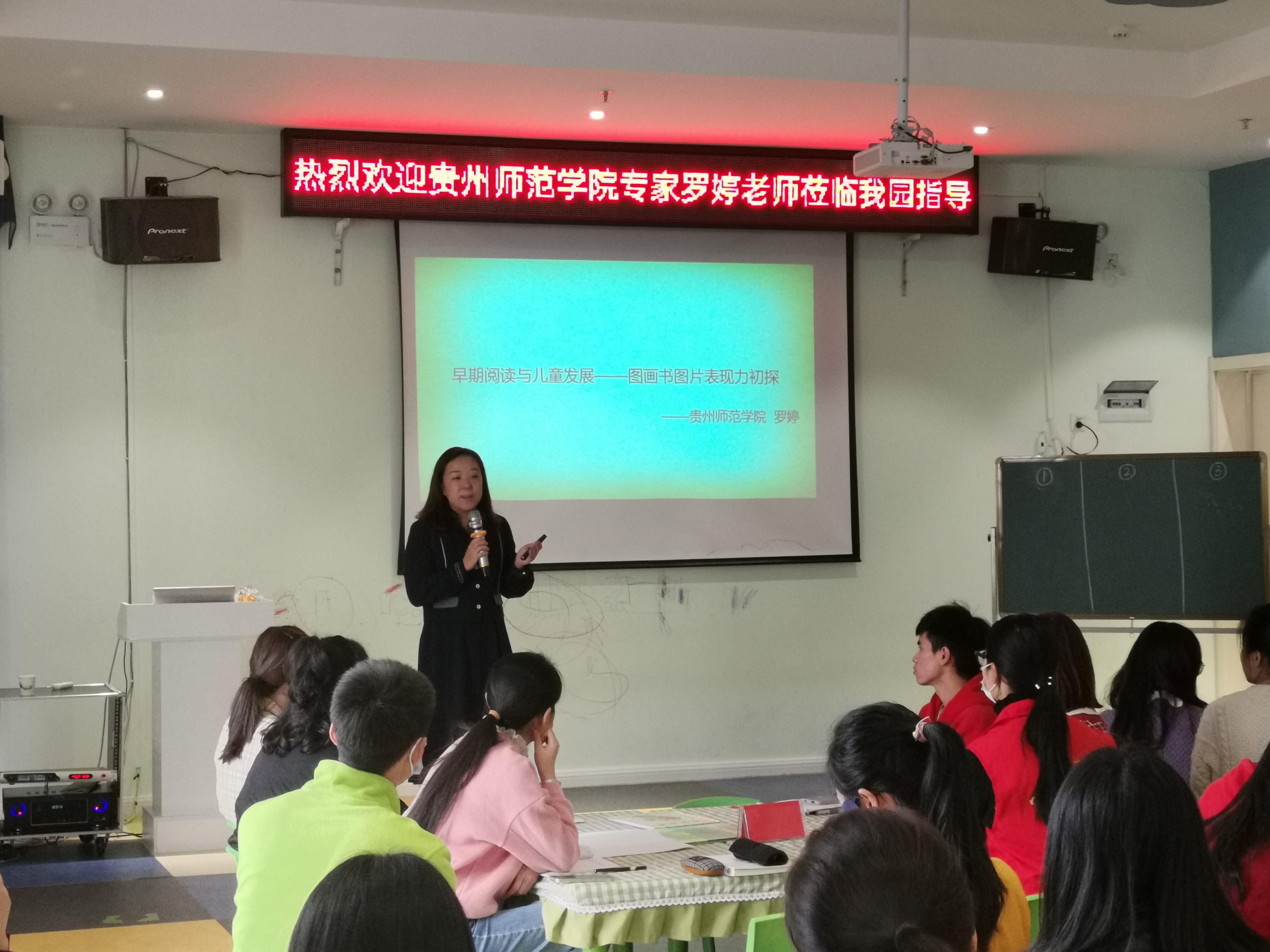 学前教育罗婷老师带领其“学前儿童语言教育”课程项目学习小组的八名学生来到乌当区高新幼儿园组织开展教研活动。本次教研活动由幼儿园大教研组长李婷老师主持,参与教研活动的有幼儿园全体教师共计19人,还有各班家长代表共计18人。