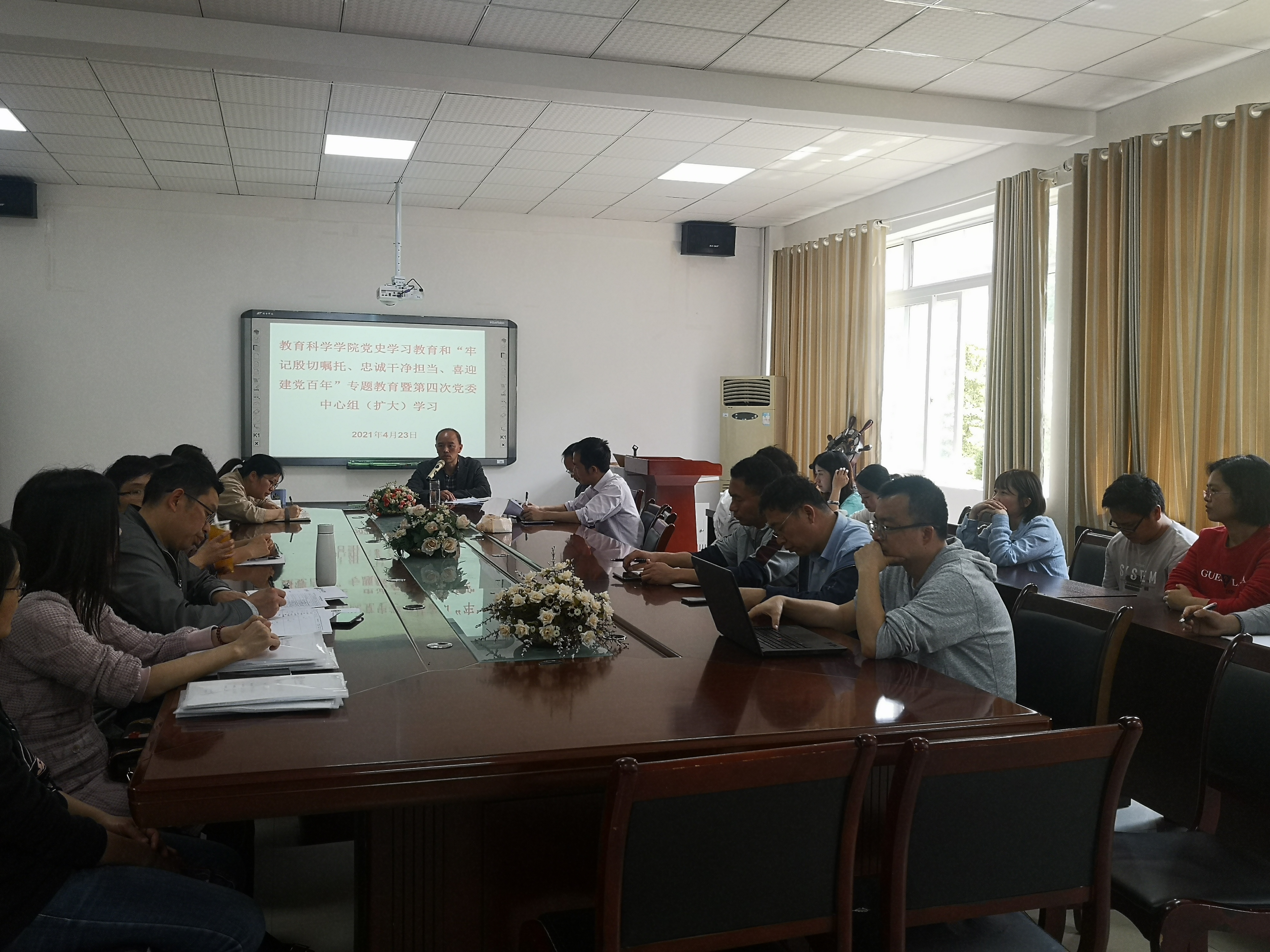 在逸夫楼学院会议室,举行党史学习教育和“牢记殷切嘱托、忠诚干净担当、喜迎建党百年”专题教育暨第四次党委中心组(扩大)学习,学院党委书记彭祥友主持学习,学院党委中心组成员,全体教师党员参加。