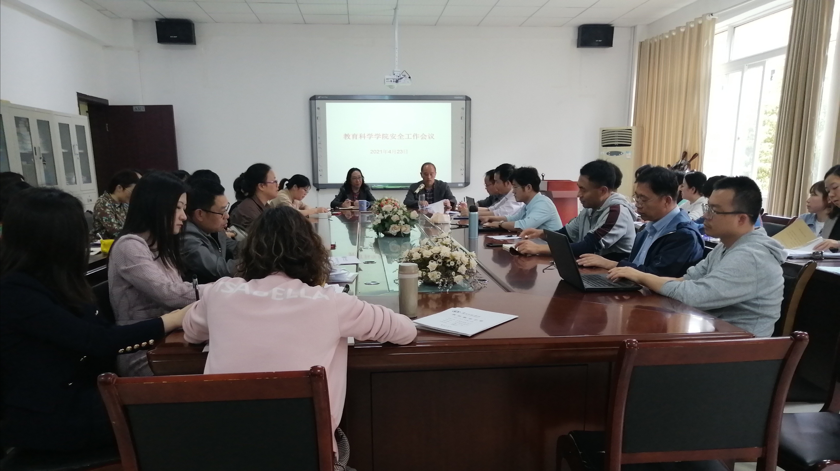 在逸夫楼学院会议室召开安全稳定工作会议,学院党委书记彭祥友做安全稳定工作讲话,刘红院长主持,全院教师参会。