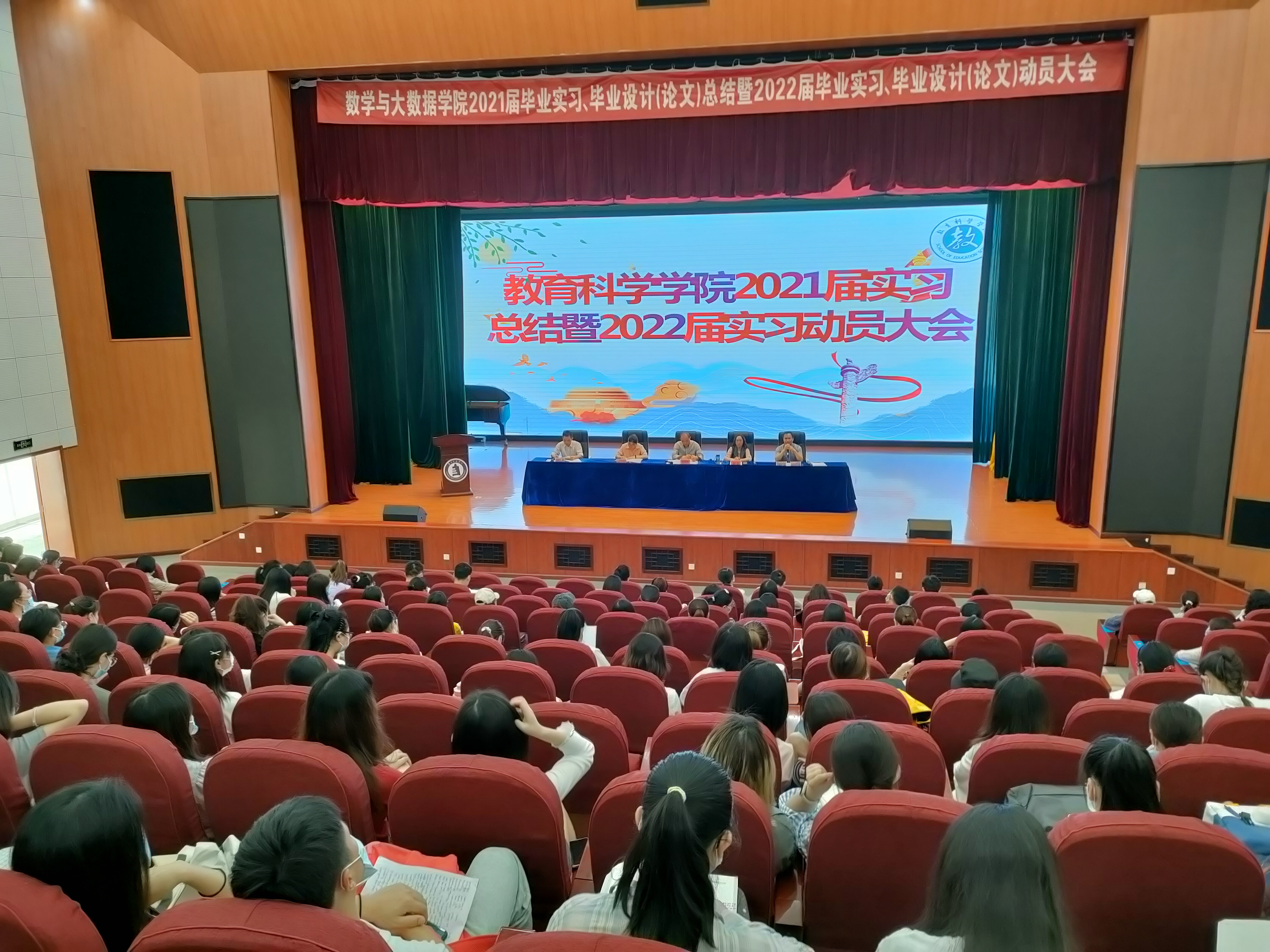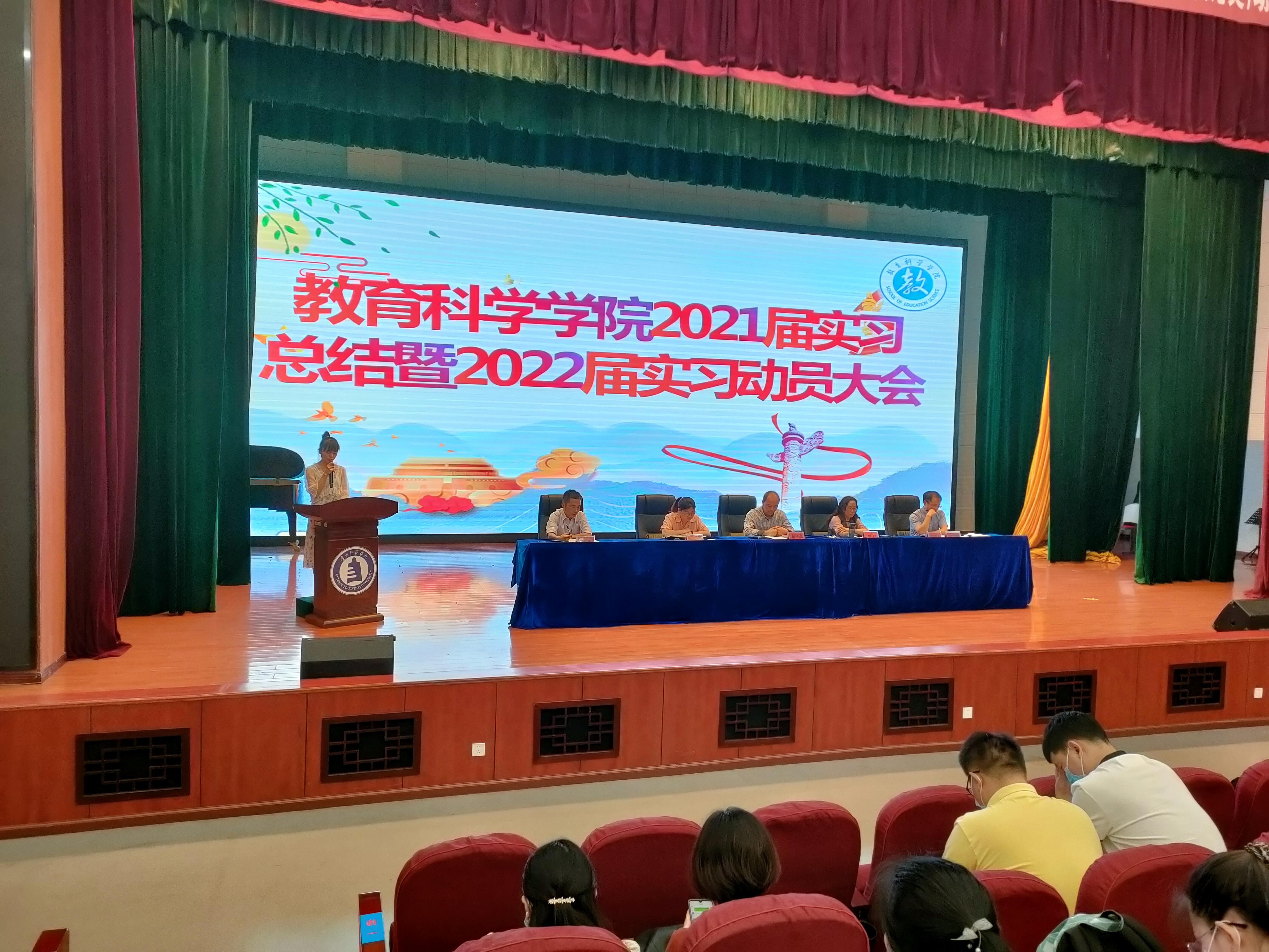 2021届实习总结暨2022届实习动员大会在逸夫楼演播厅召开。学院党委书记彭祥友、院长刘红、党委副书记傅小芳、副院长袁川、副院长黎平辉、系主任、辅导员(班主任)、指导老师、2018级全体学生以及2017级优秀实习生代表参加。会议由副院长黎平辉主持。